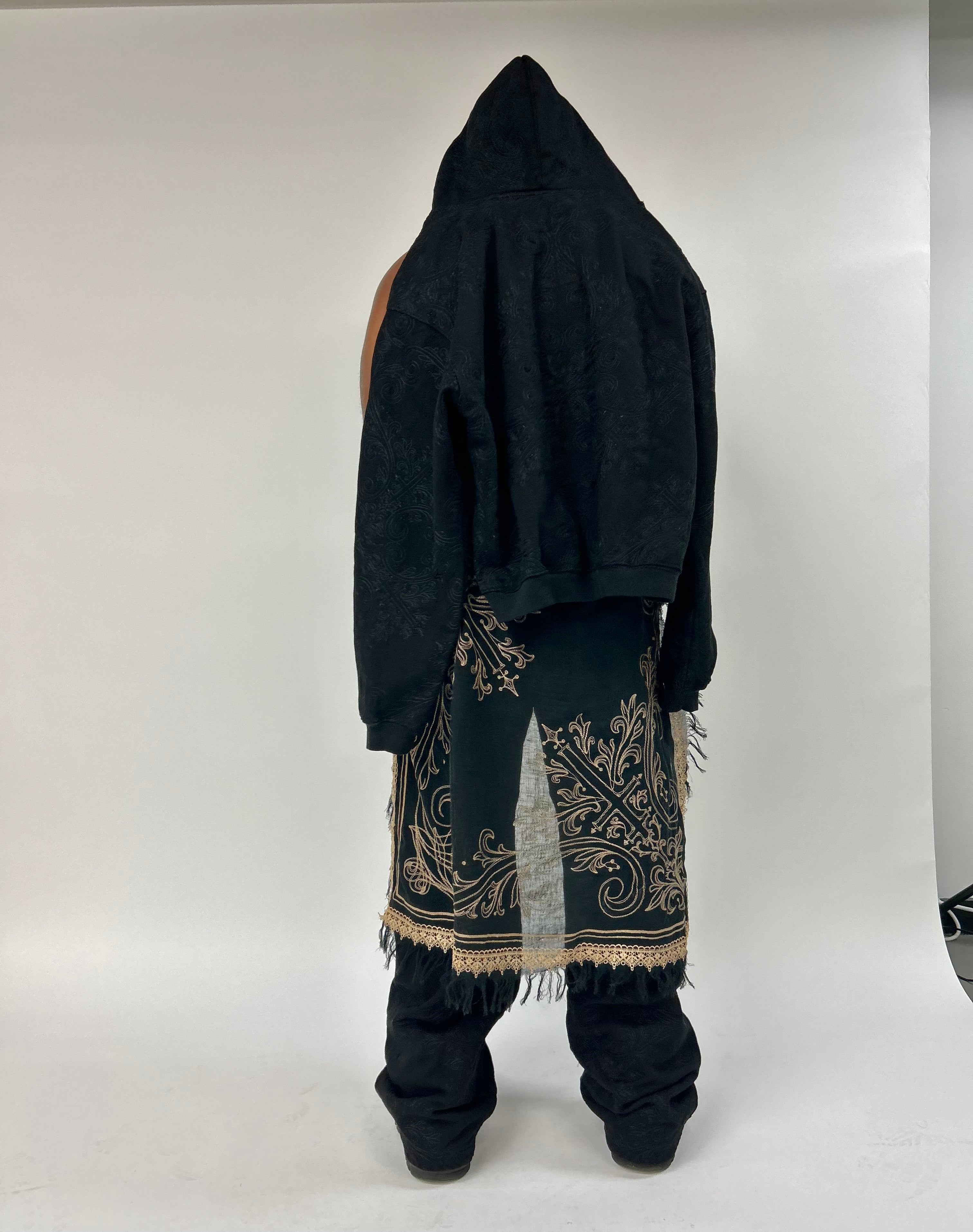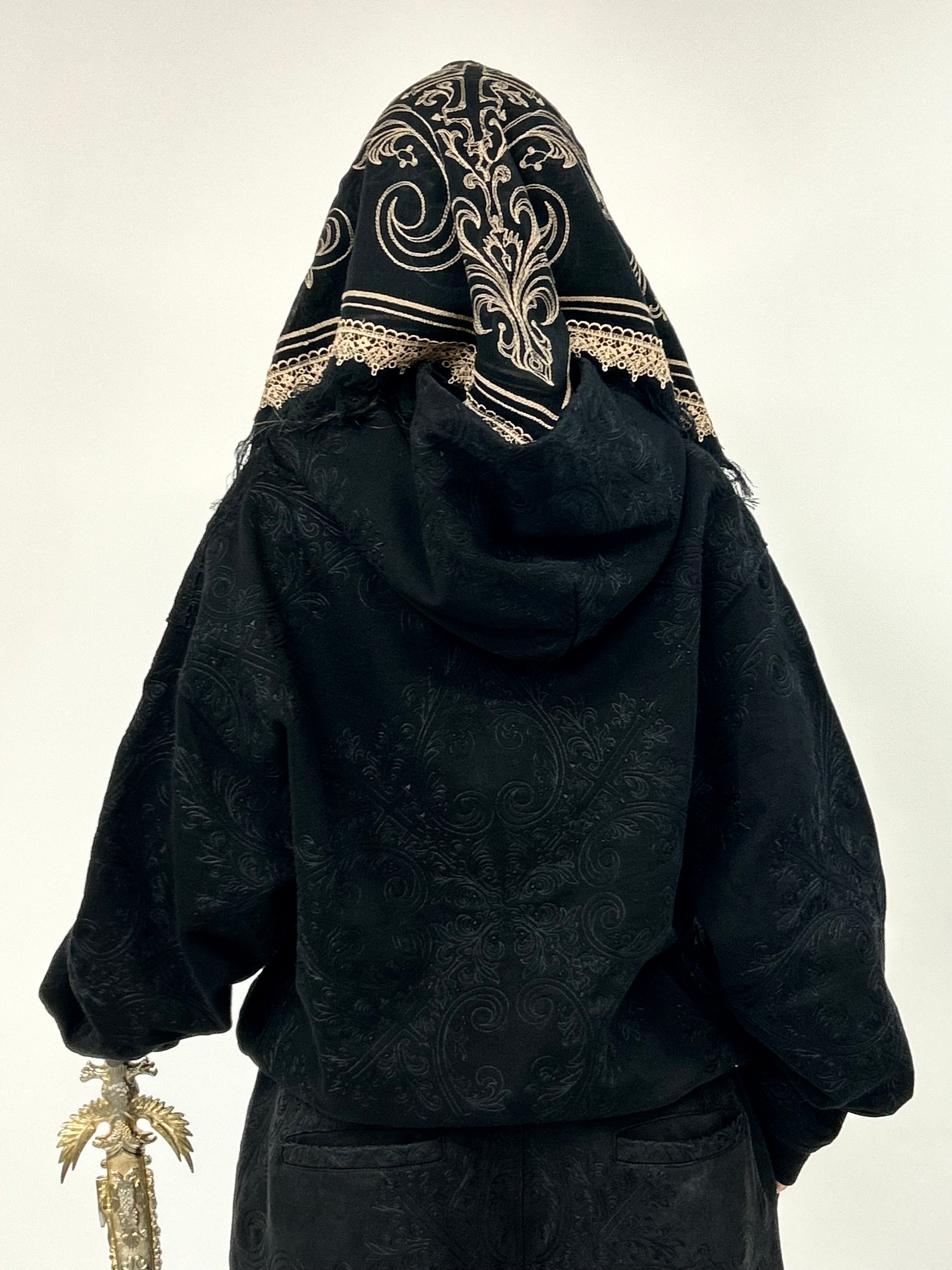 Heavyweight french terry fabric with all-over "Trance" embroidery.
