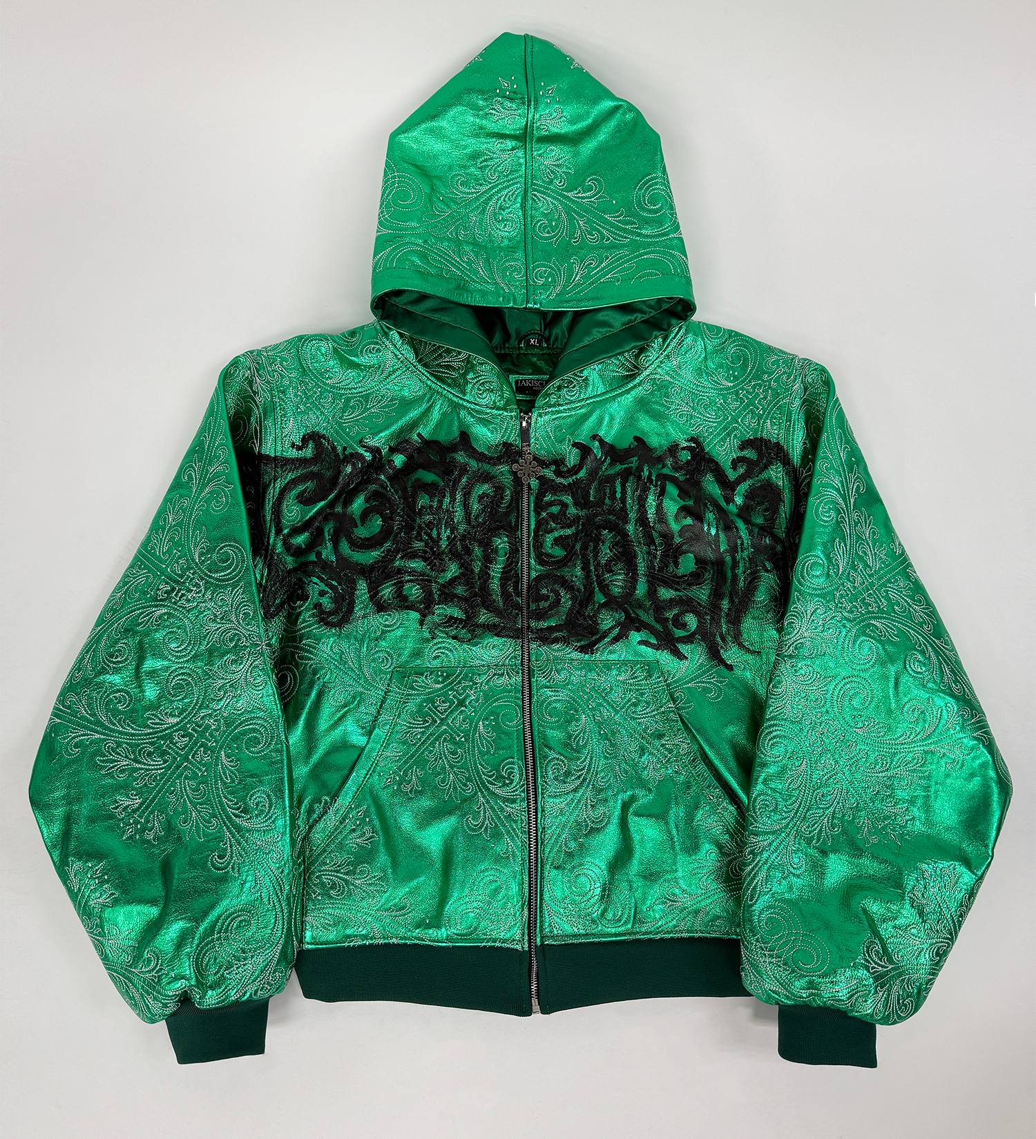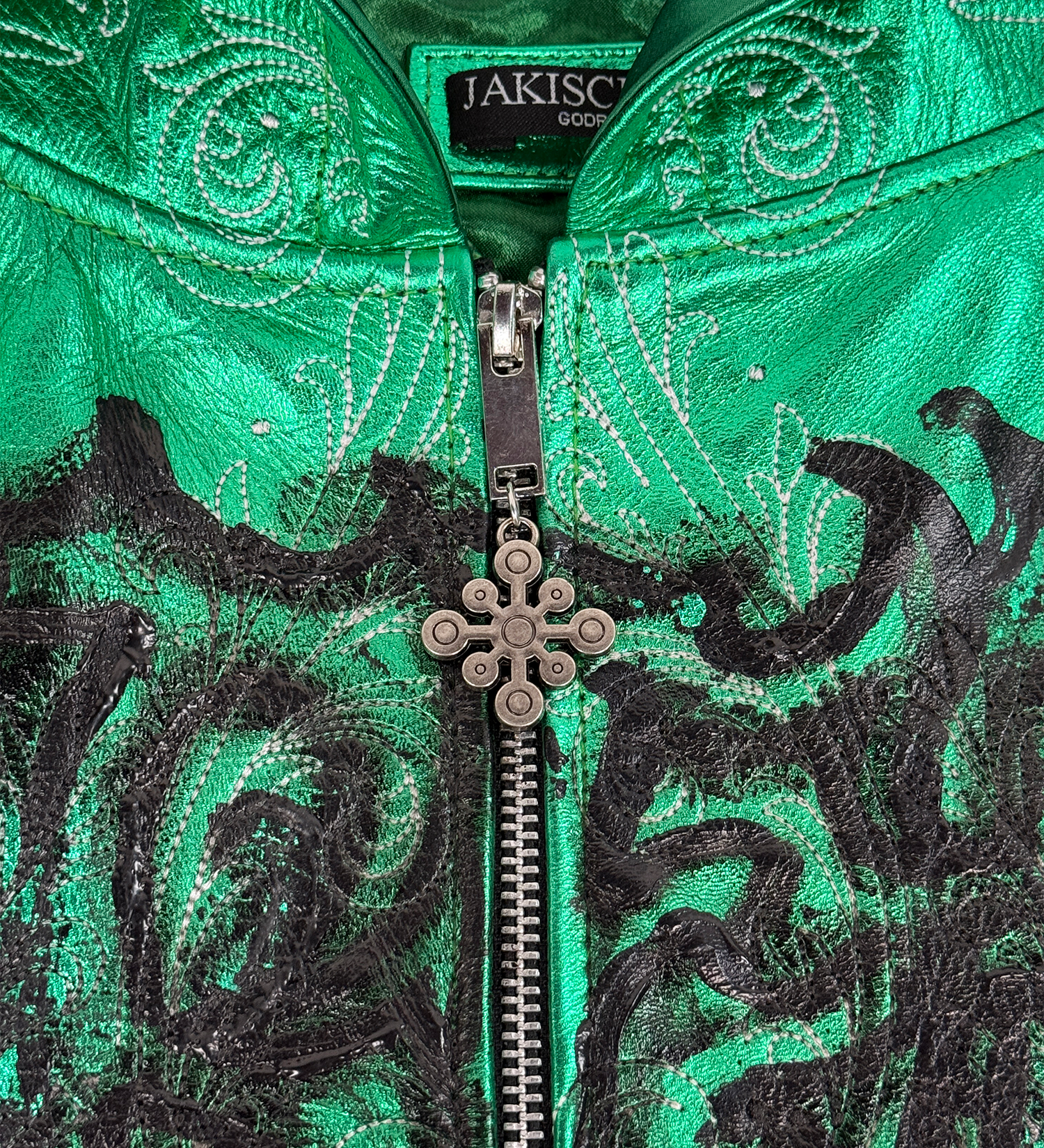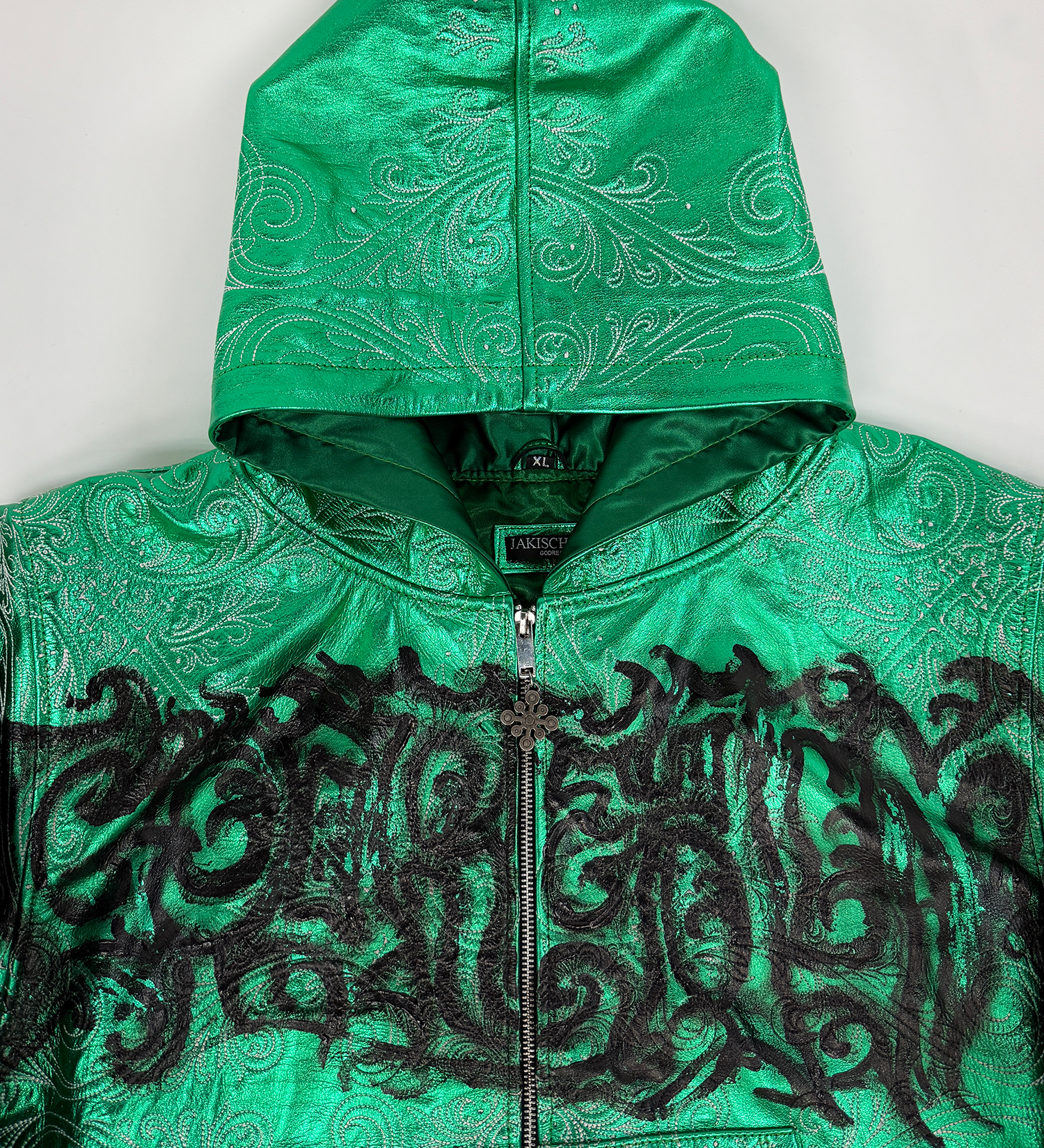 Emerald color leather zip-up jacket with all-over "Trance" embroidery. Hand-painted front and back.