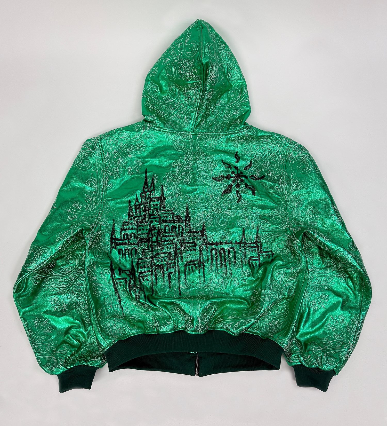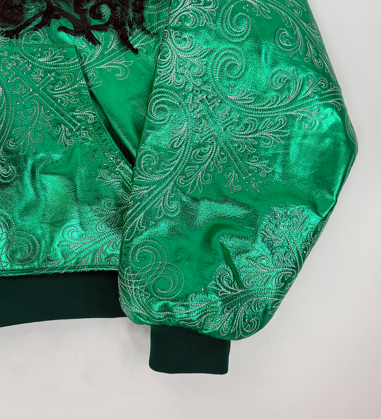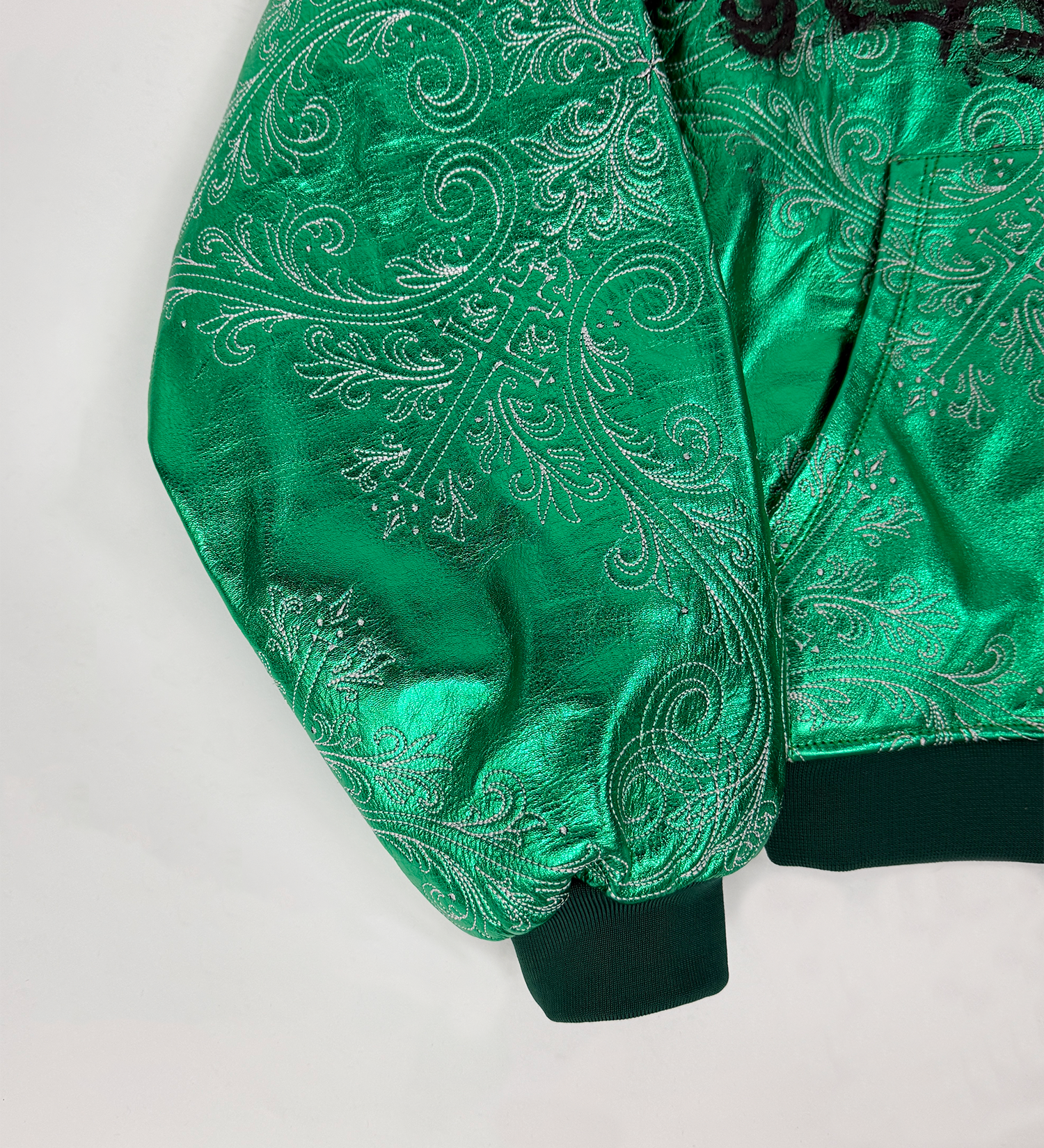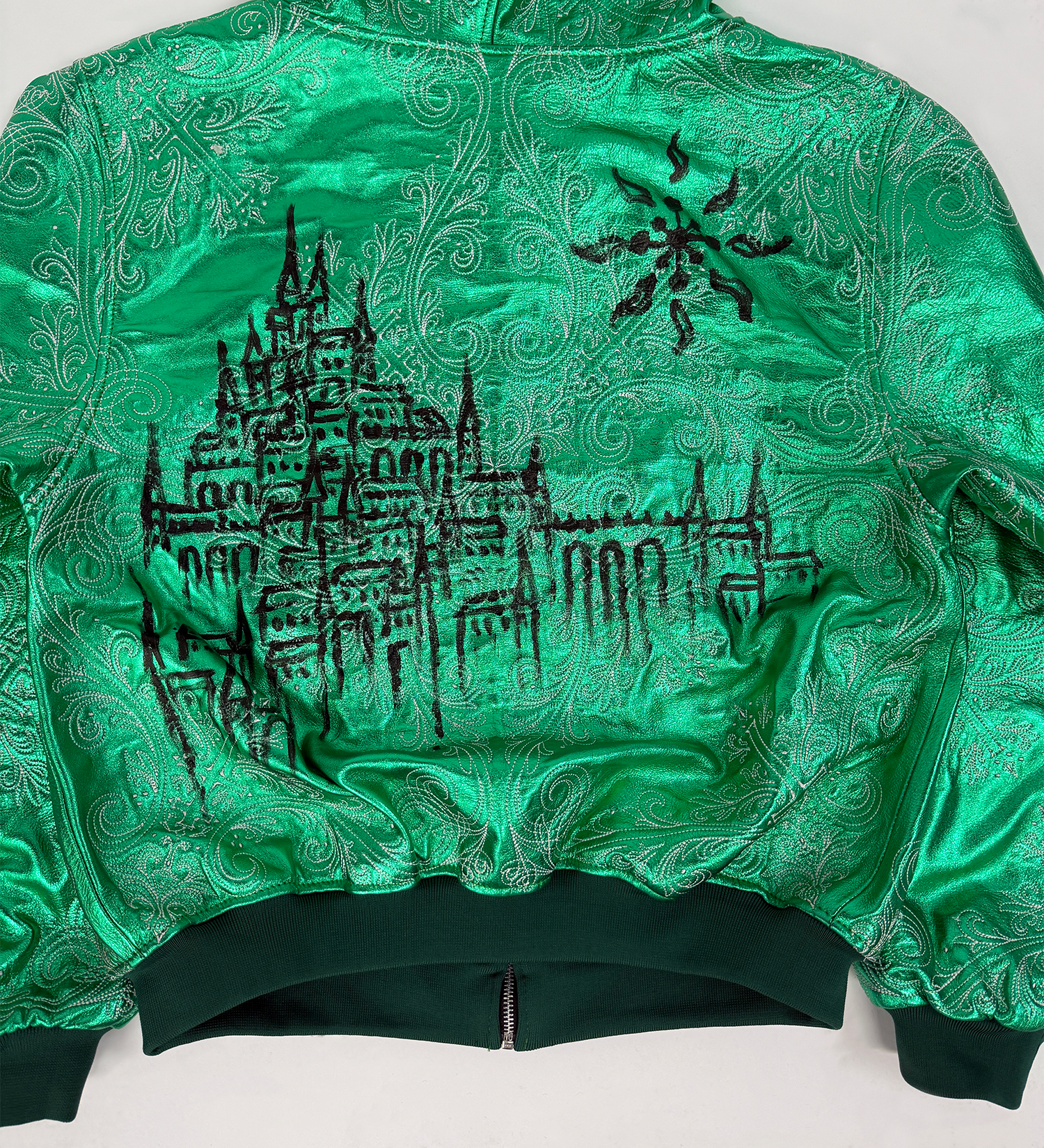 Emerald color leather zip-up jacket with all-over "Trance" embroidery. Hand-painted front and back.