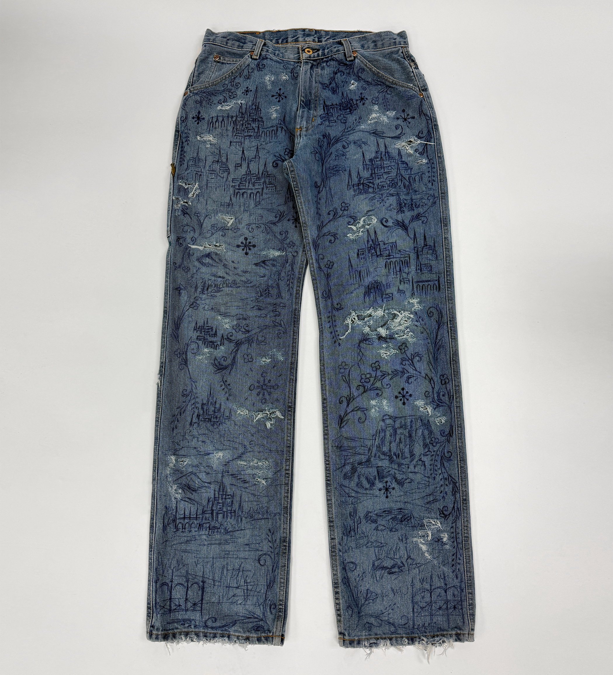 1 of 1 reworked vintage Ralph Lauren jeans. Hand-drawn and distressed.