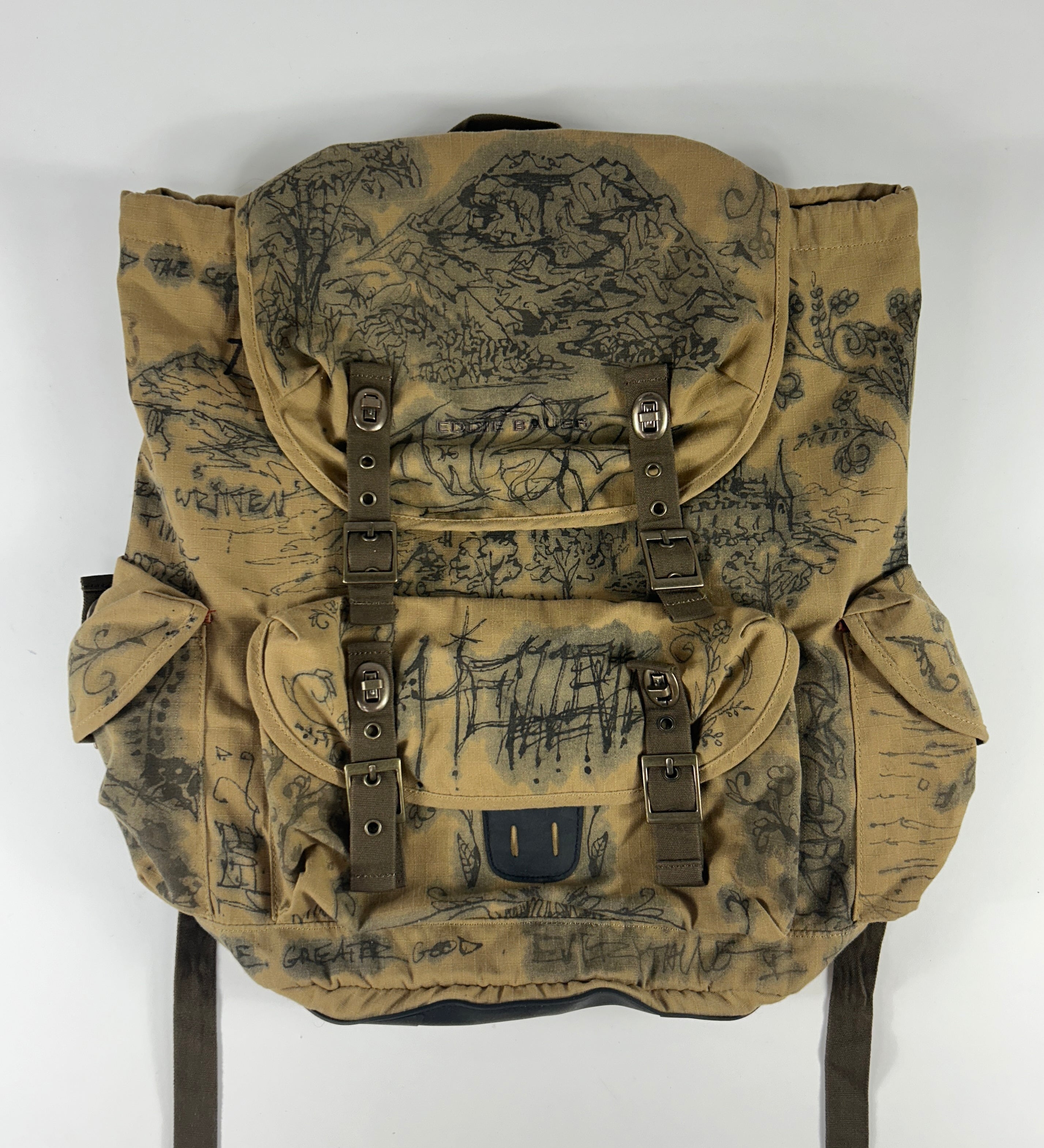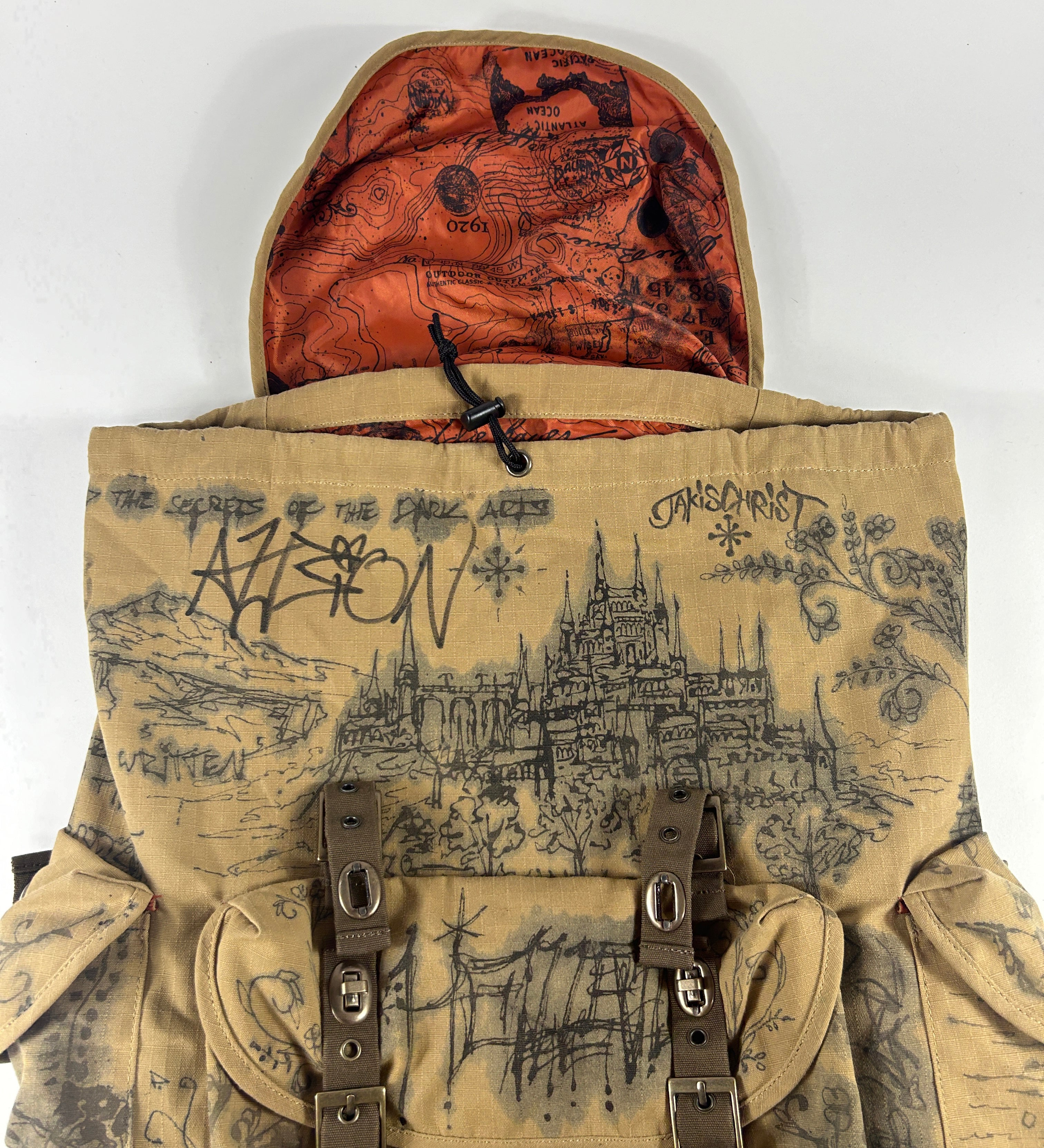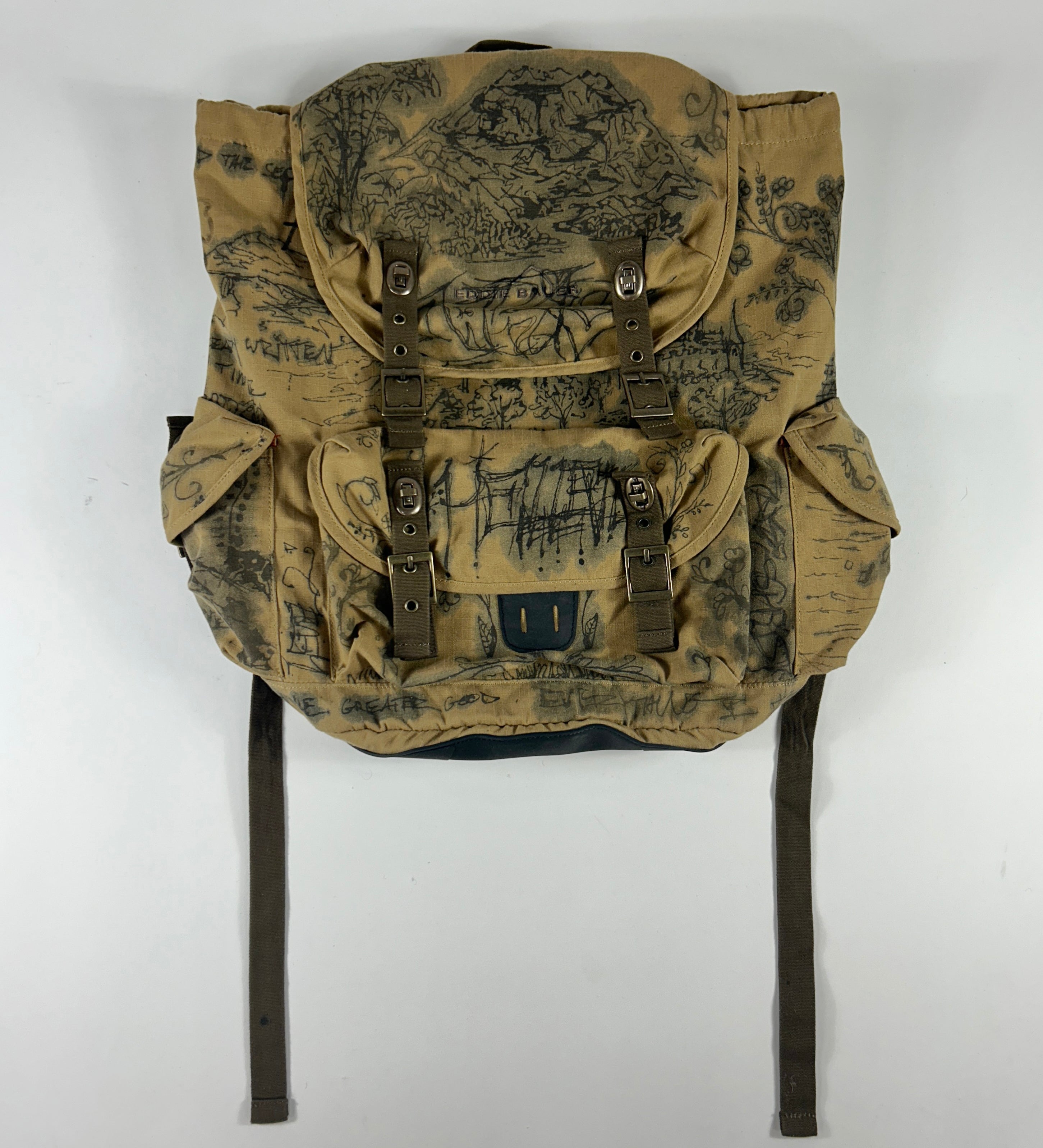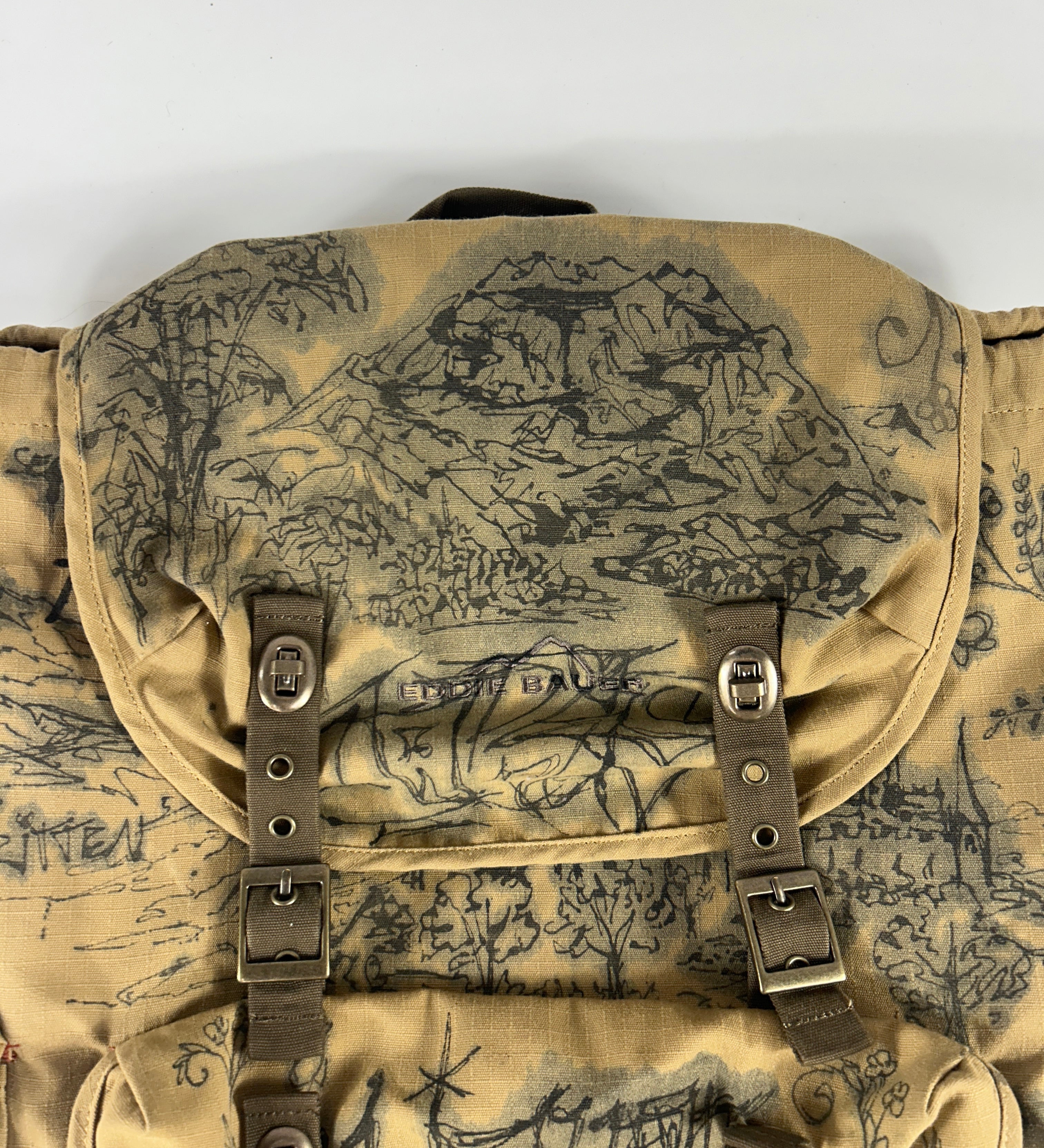Eddie Bauer backpack with all-over freehand illustrations and map lining.