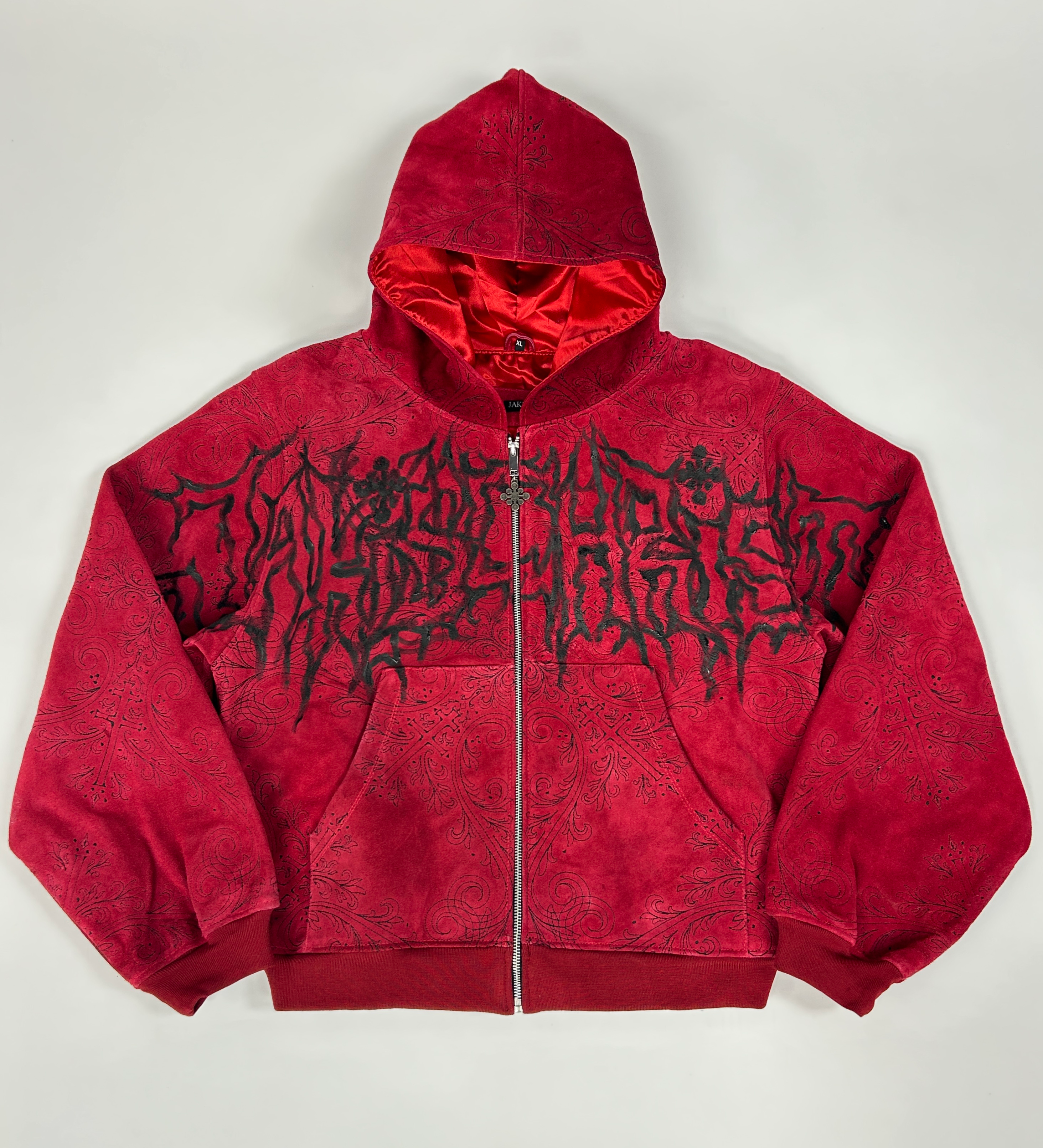 Suede leather zipup jacket with all-over "Trance" embroidery. Hand-painted text on the front.
