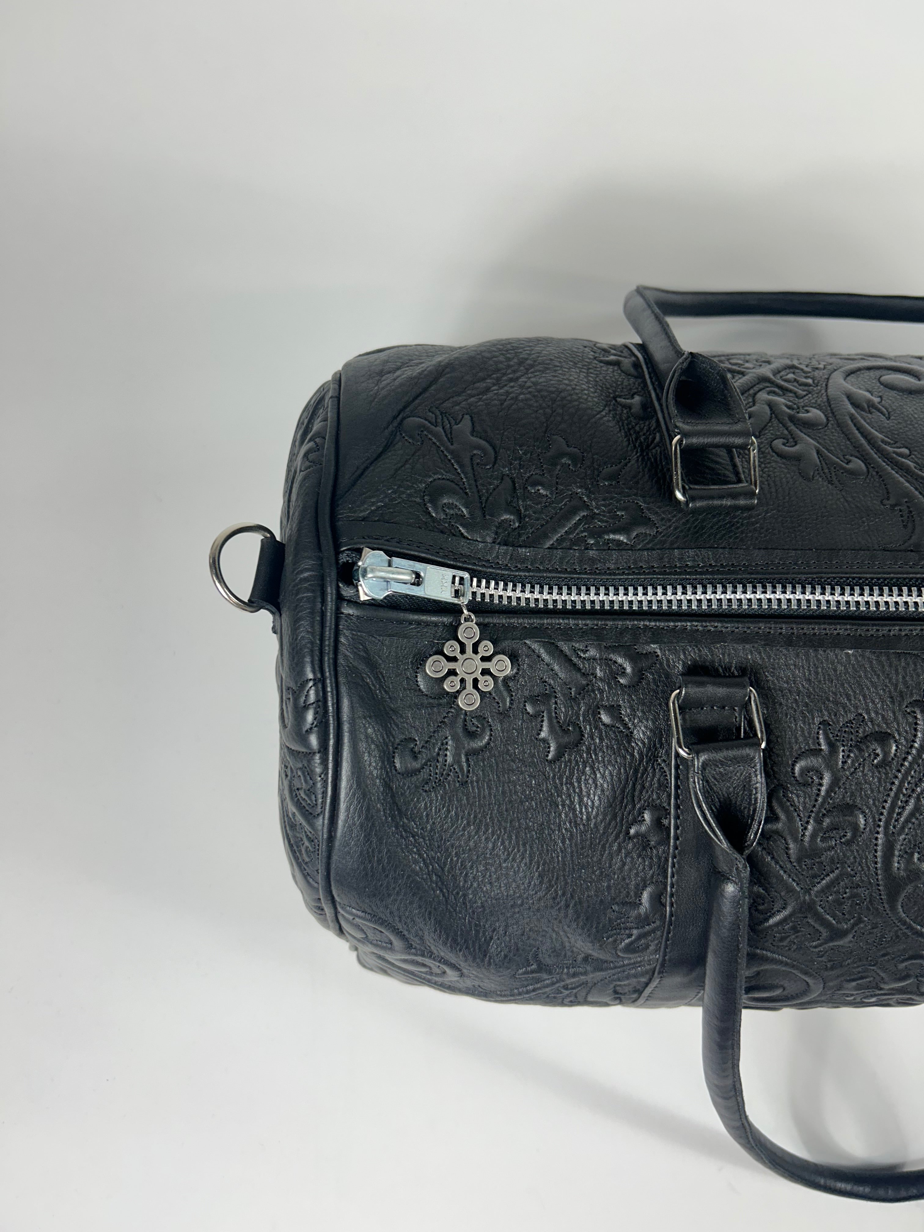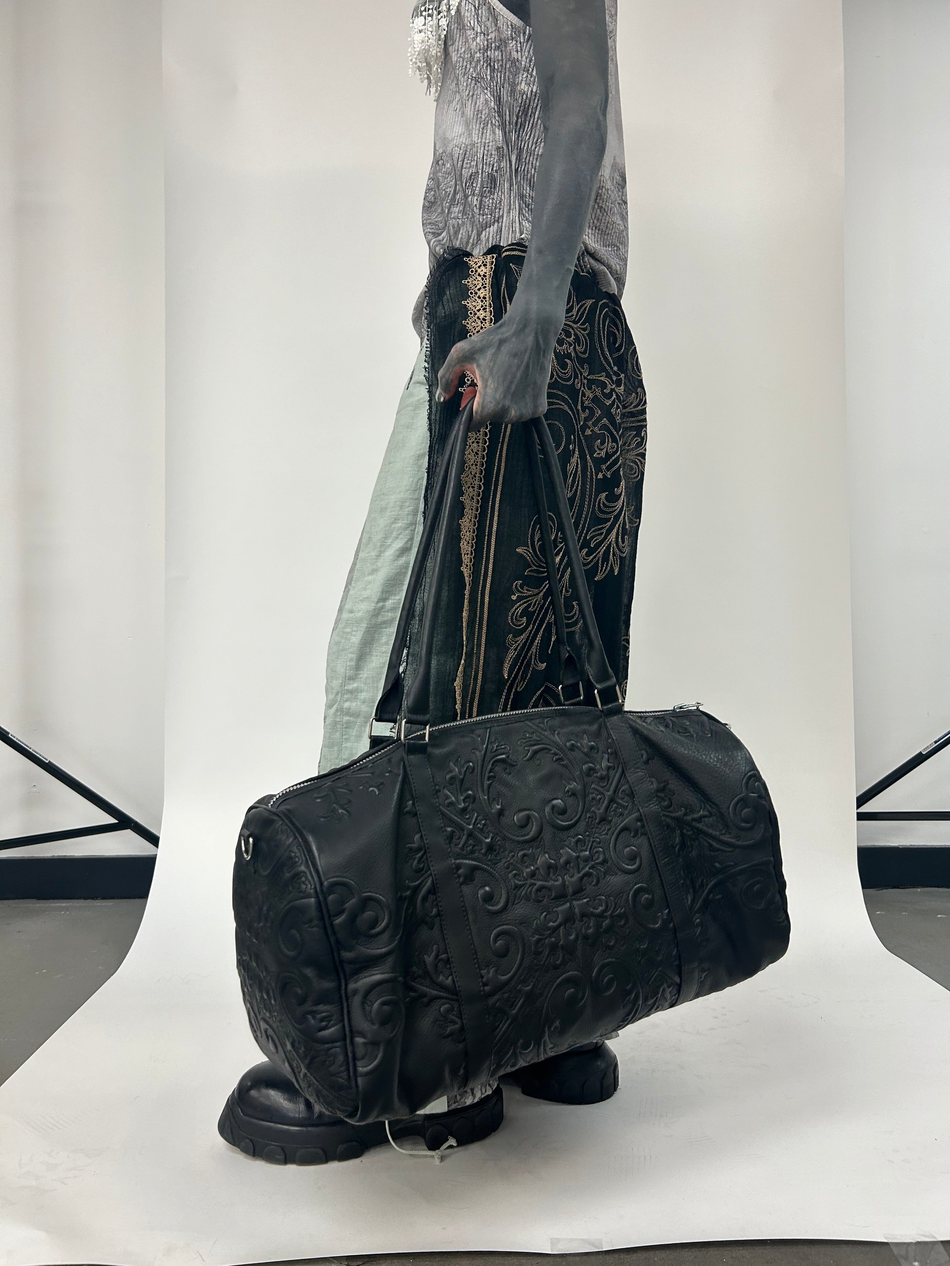 Ultra heavy, top shelf, natural oil-based leather duffle bag. All over embossed "TRANCE" embroidery.