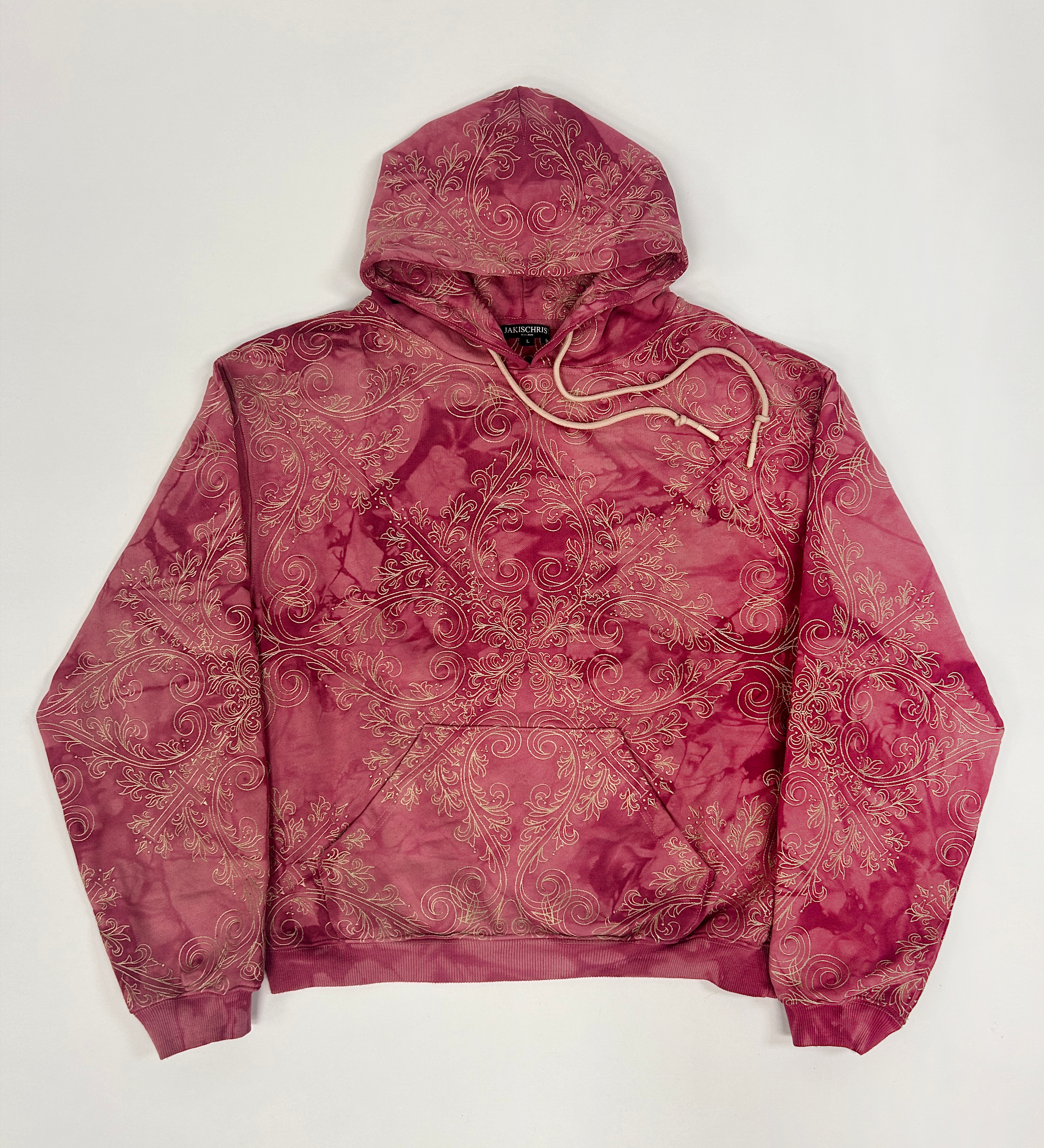 Heavyweight french terry fabric, hand dyed wine color with all-over gold Trance embroidery.