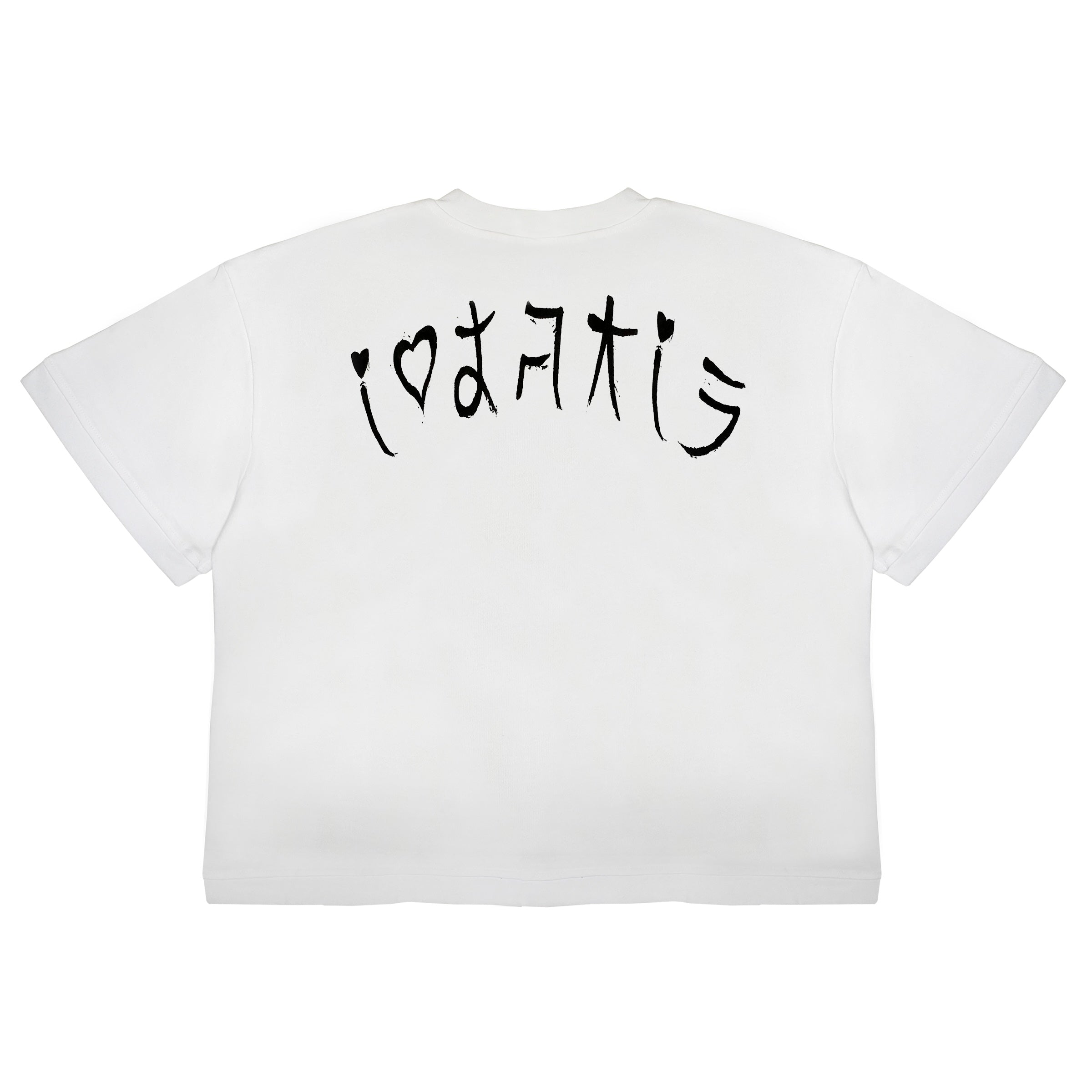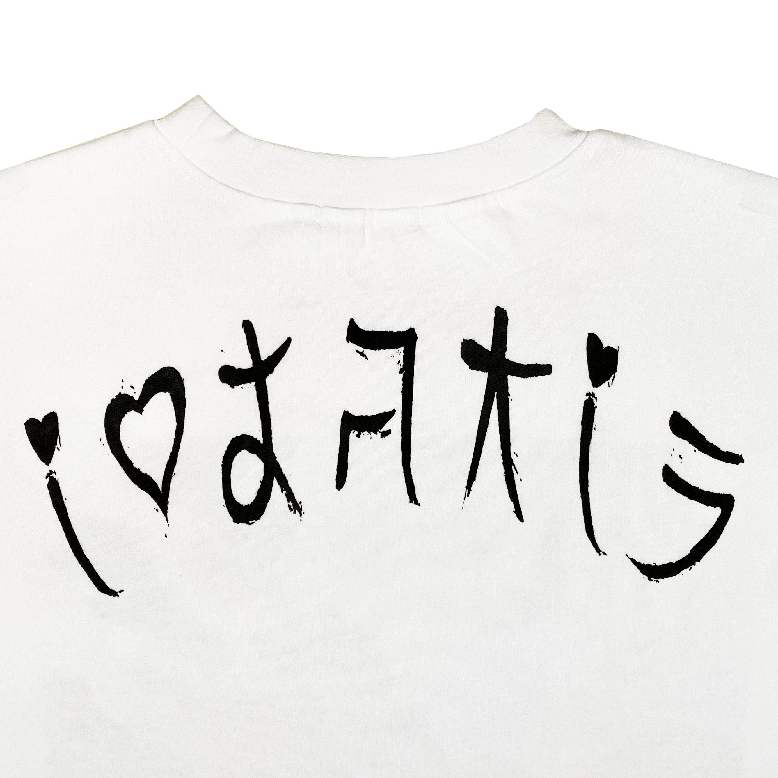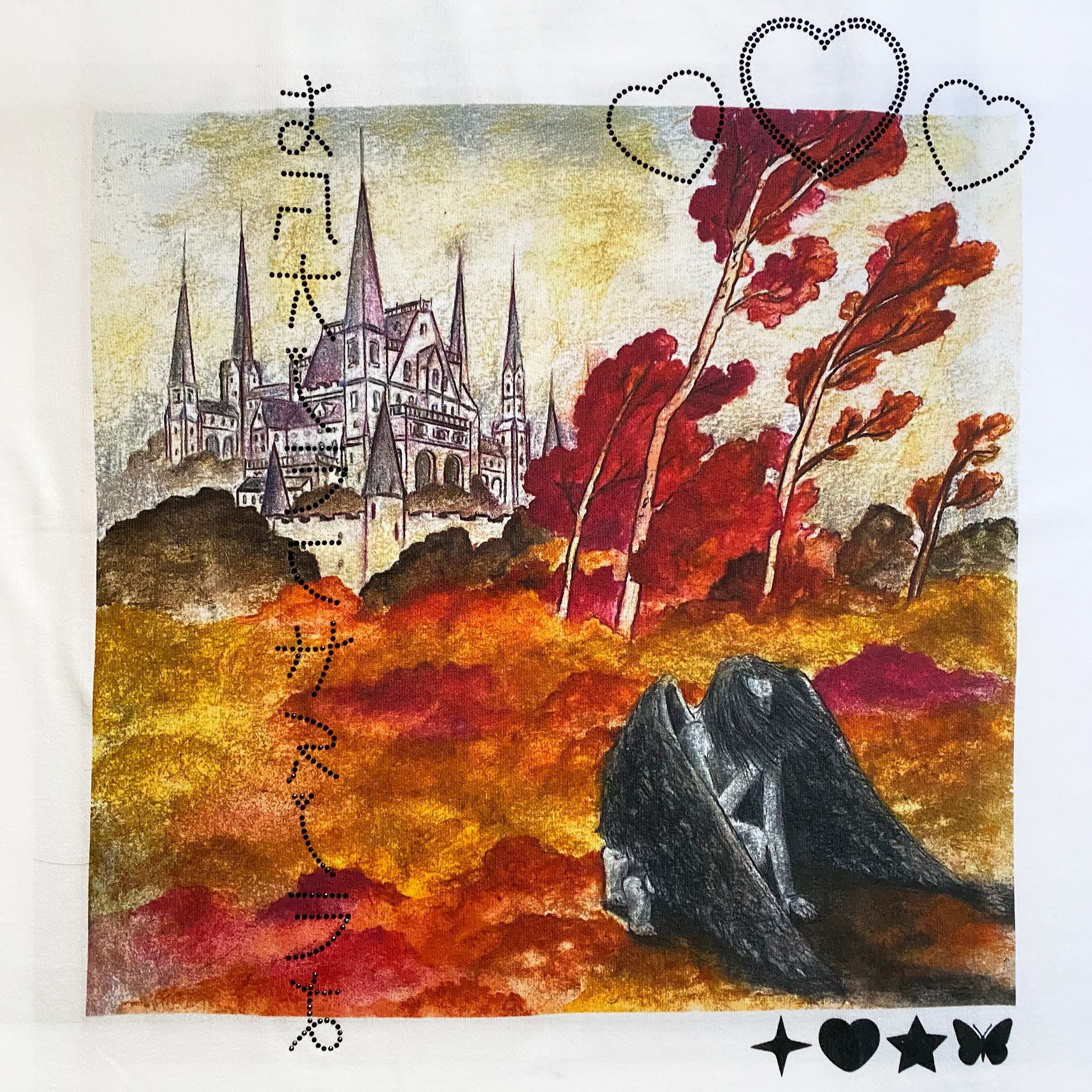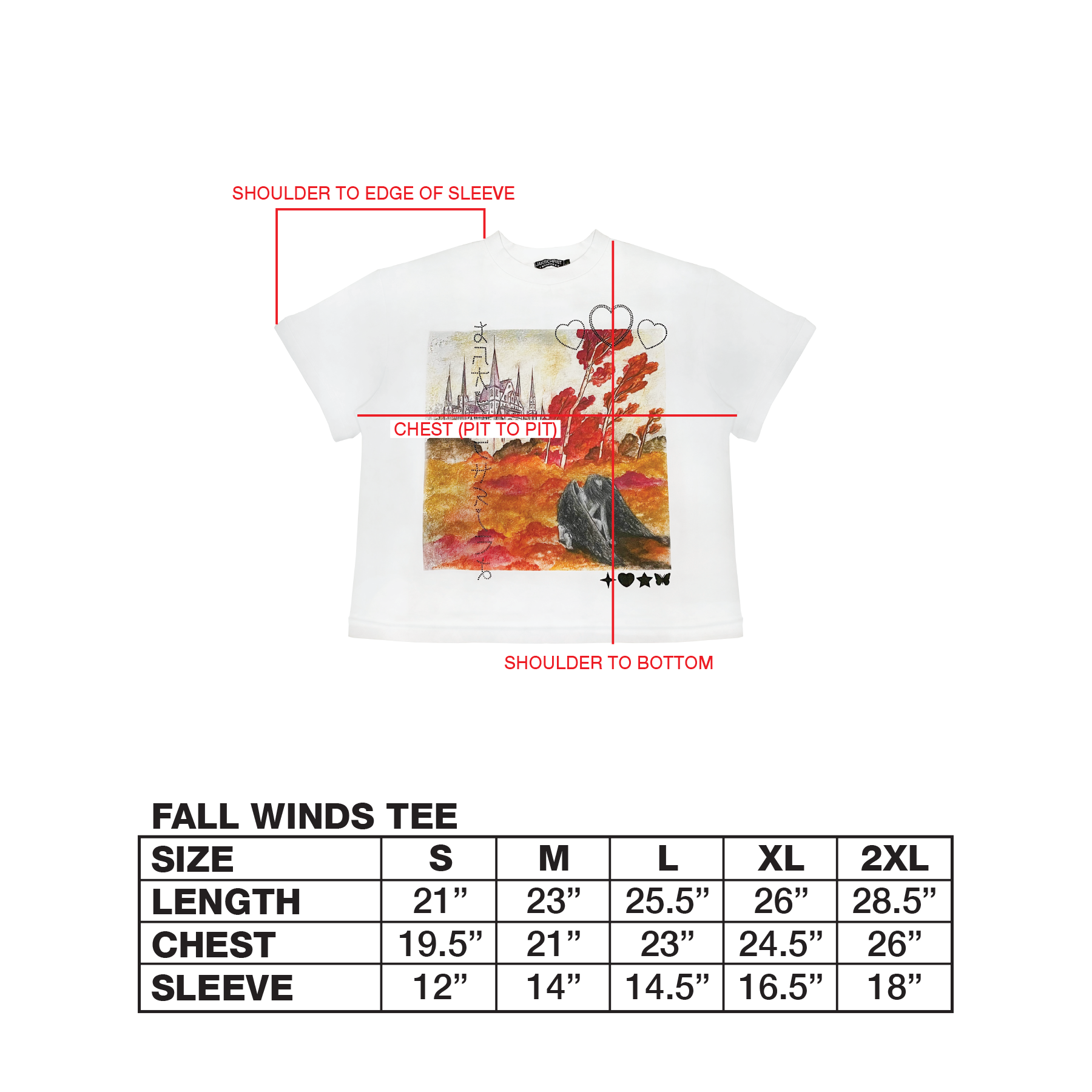 HEAVYWEIGHT ULTRA SOFT TEE WITH FRONT "FALL WINDS" ILLUSTRATION PRINT, "I <3 JAKIS" BACK PRINT, & RHINESTONE LOGO & HEARTS OVERTOP.
