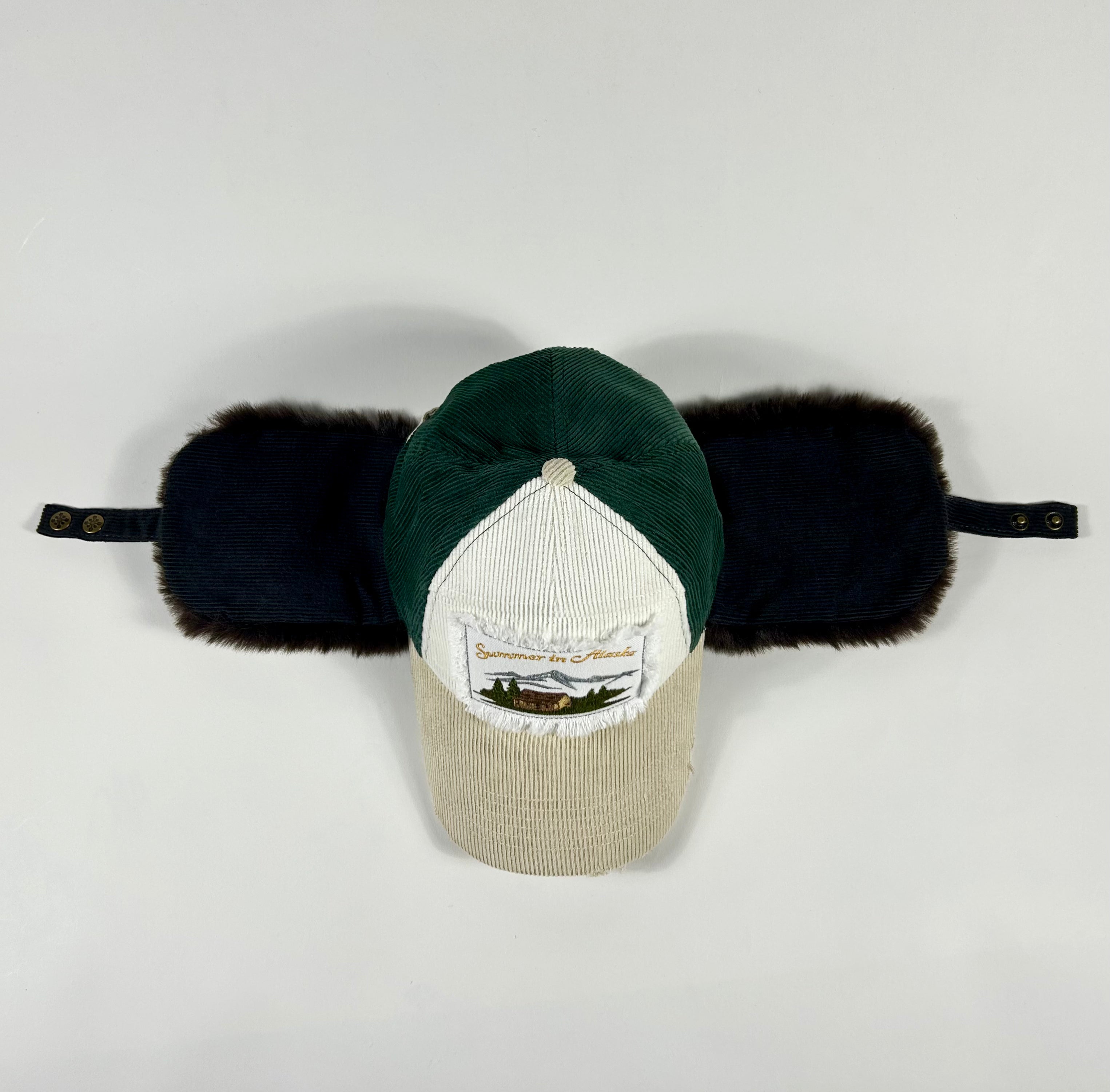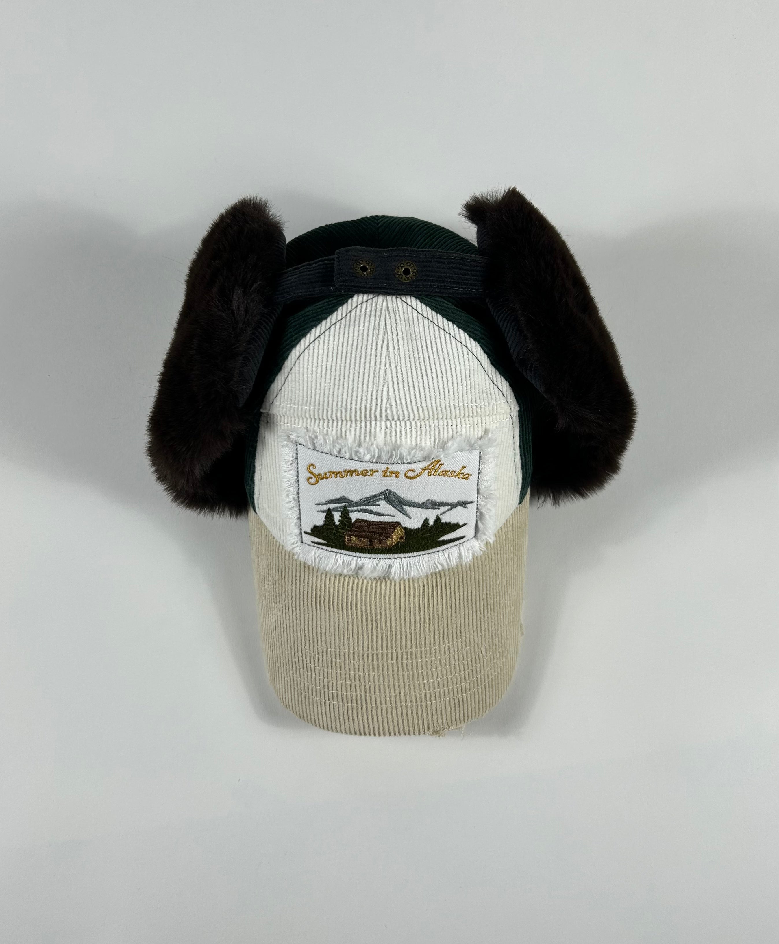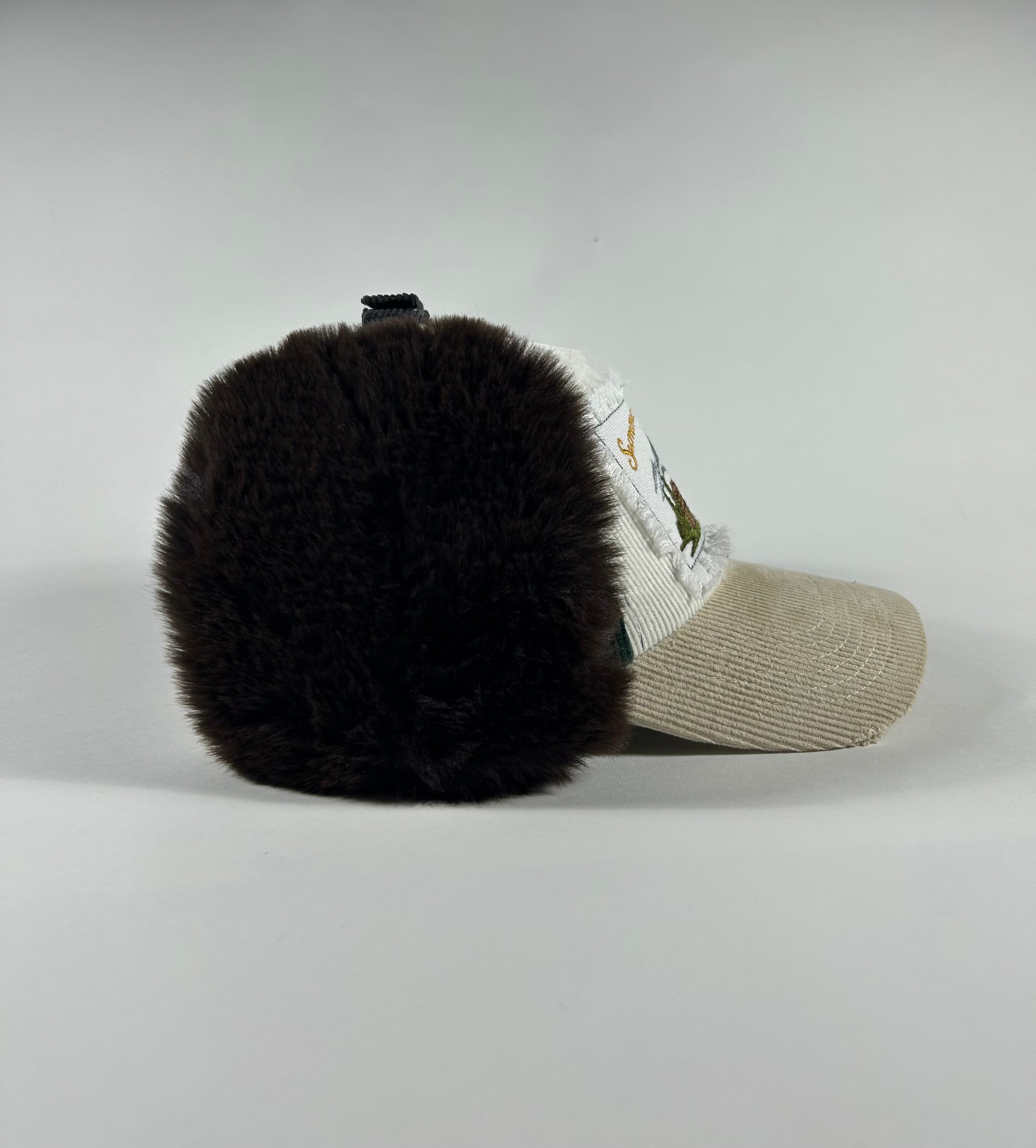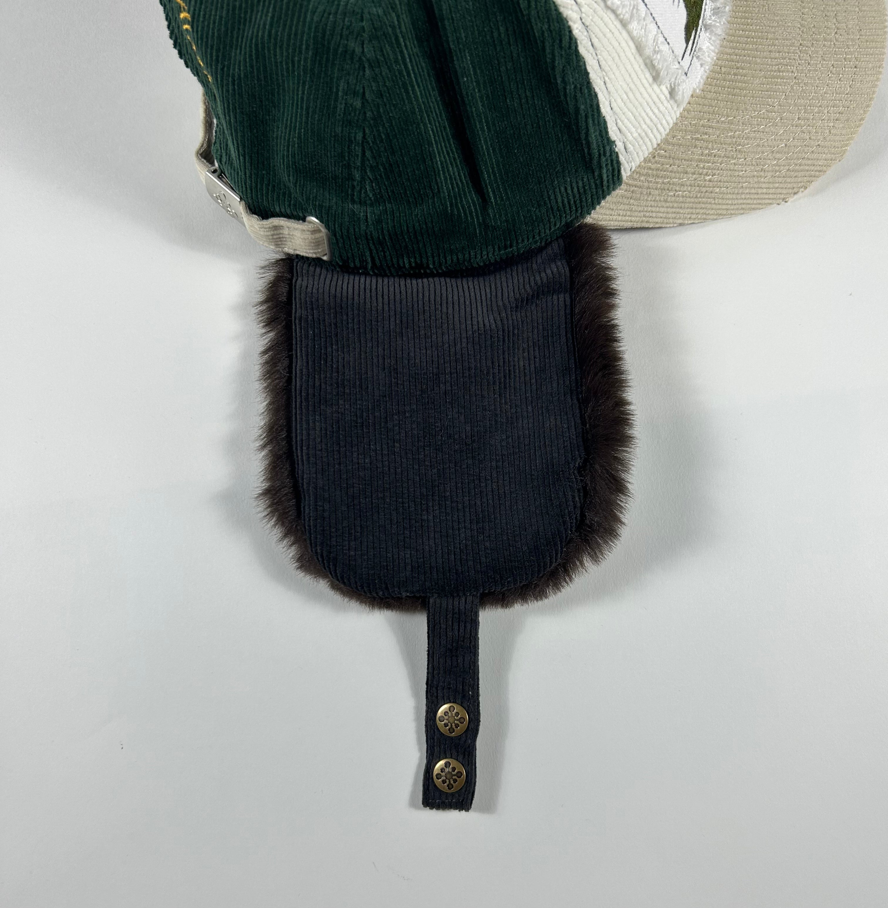 Corduroy cap with fur lining, embroidered patch with distressing.