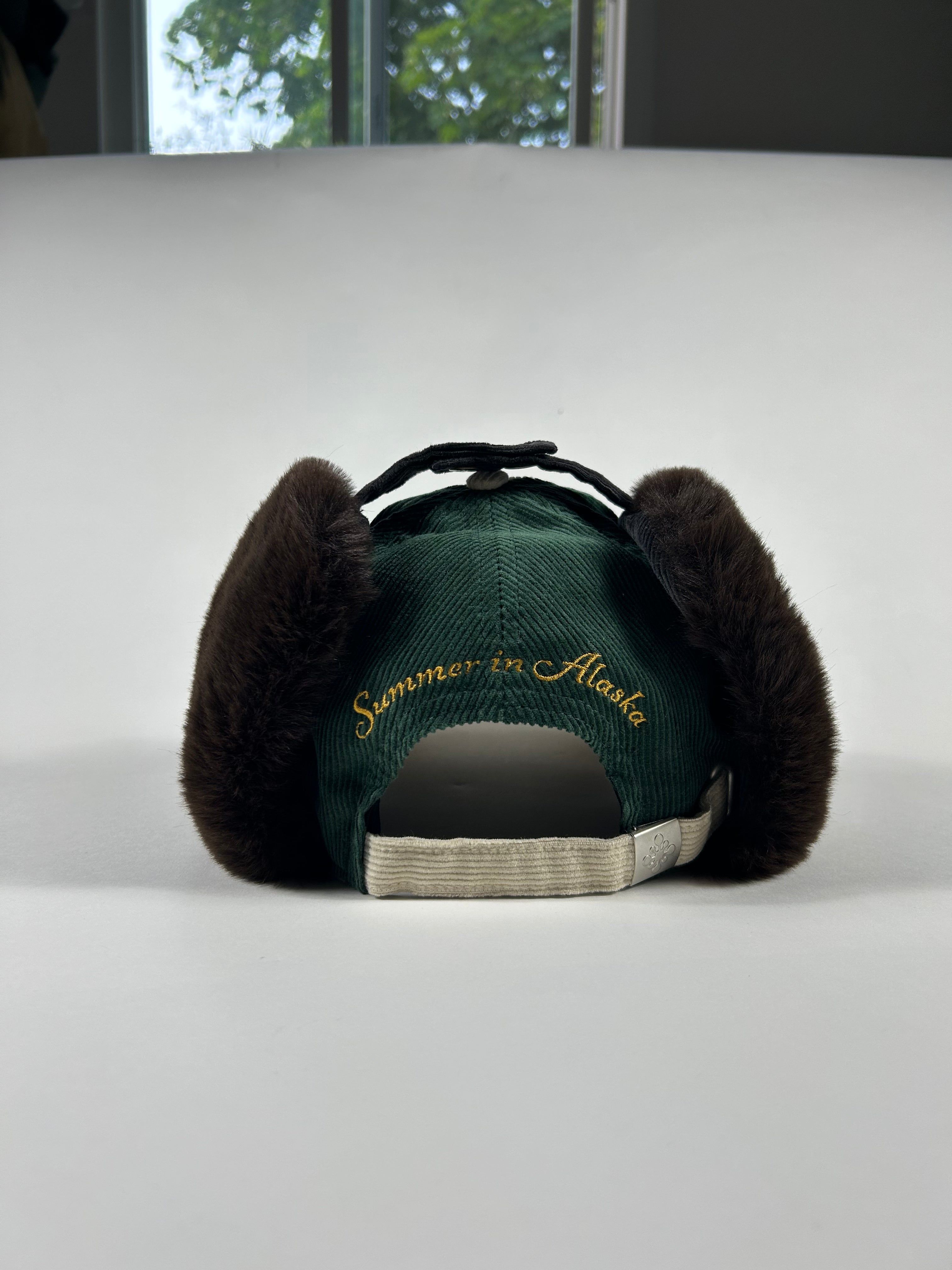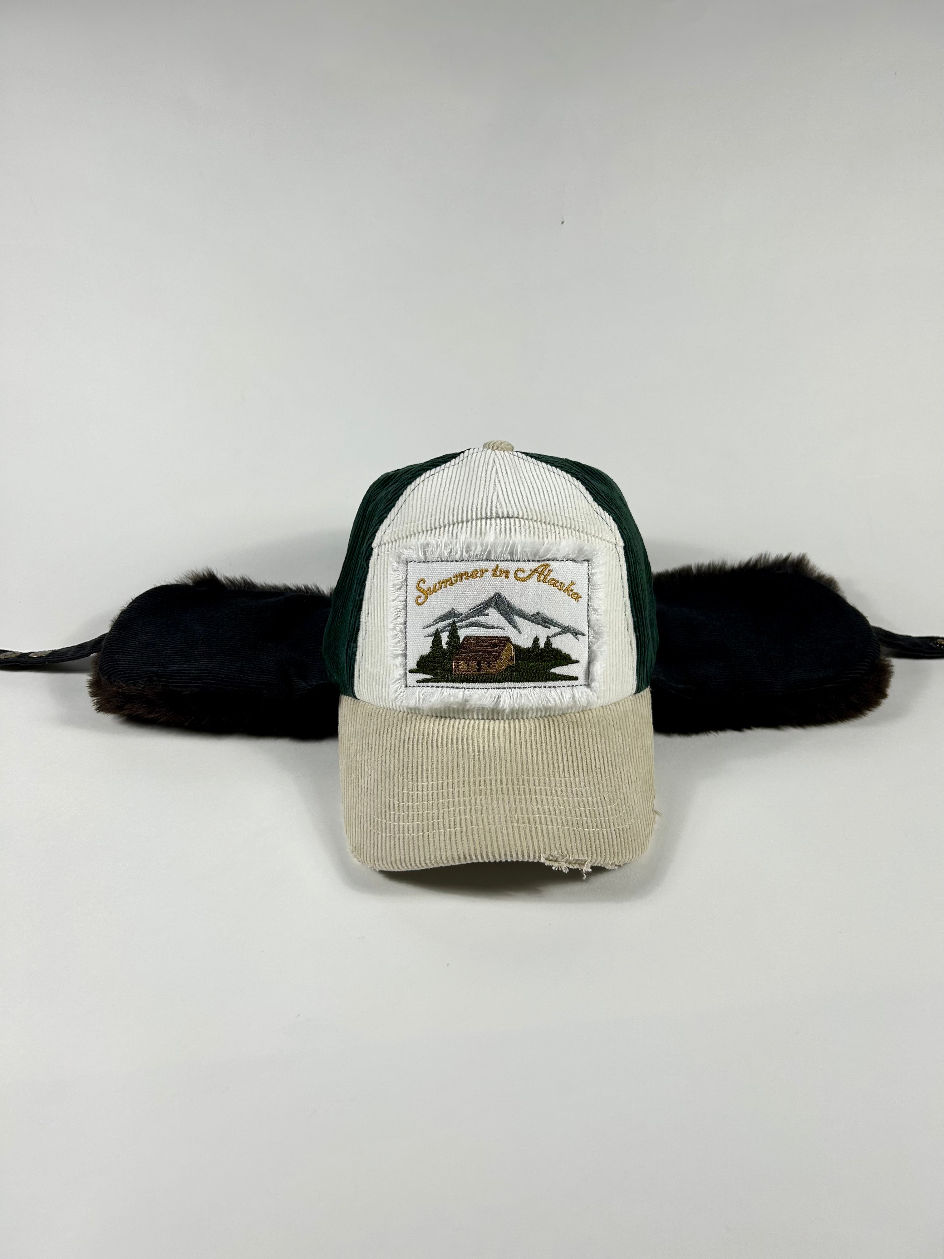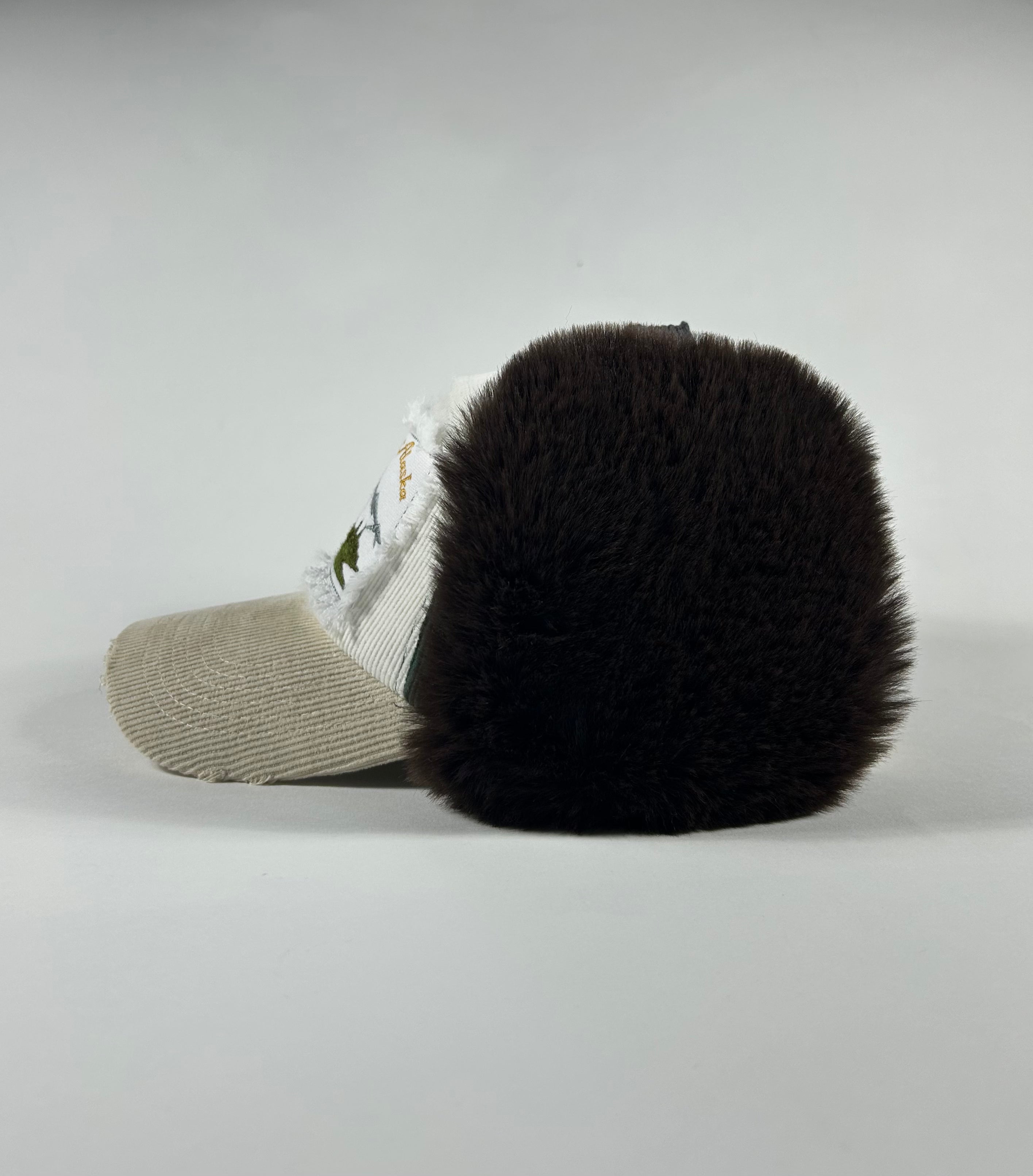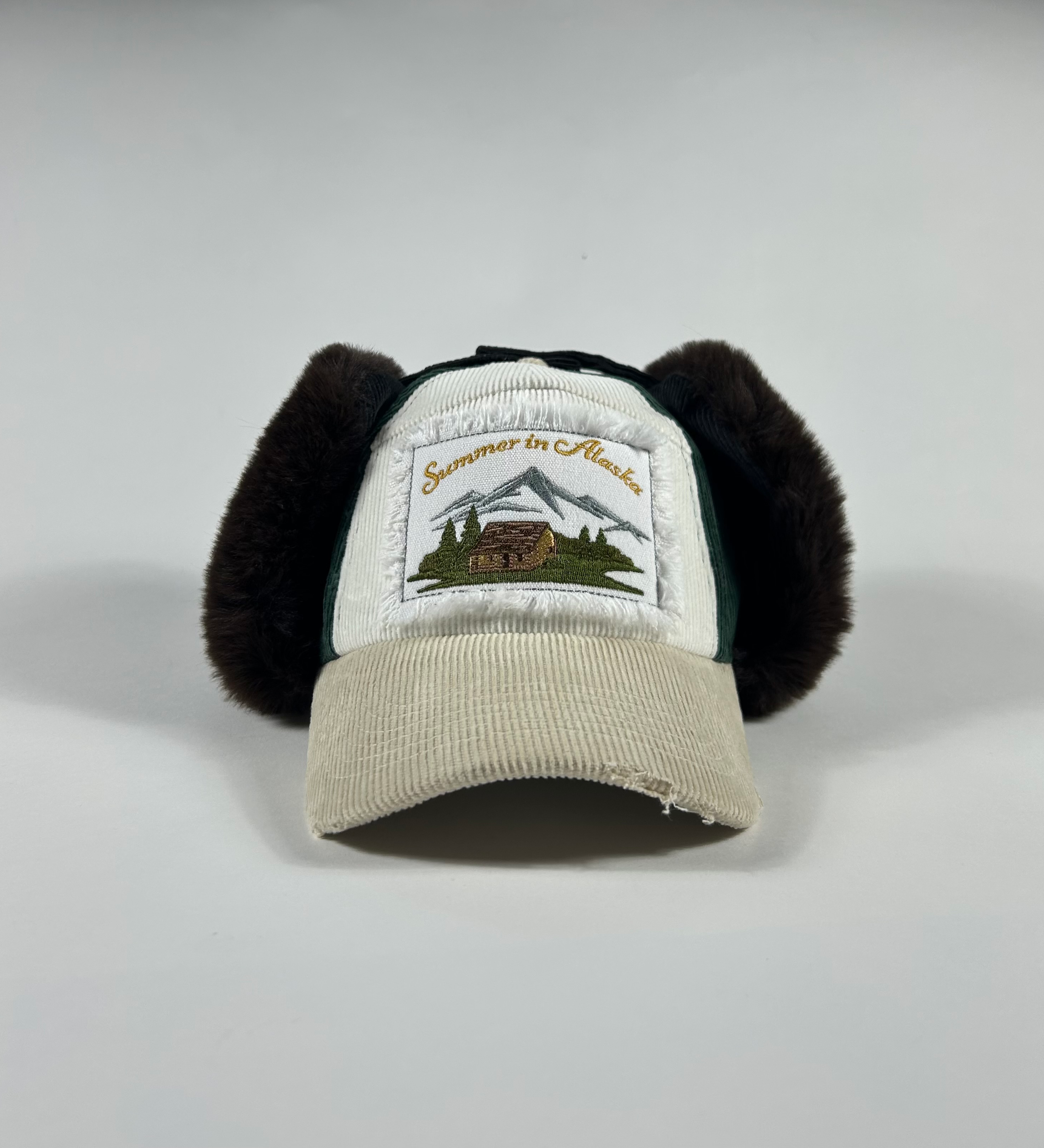 Corduroy cap with fur lining, embroidered patch with distressing.