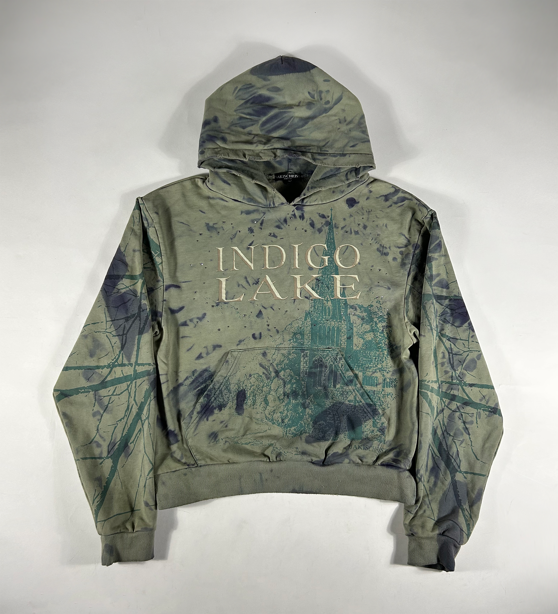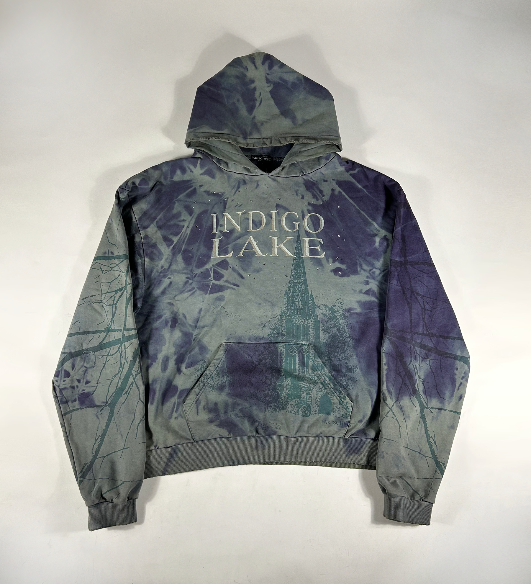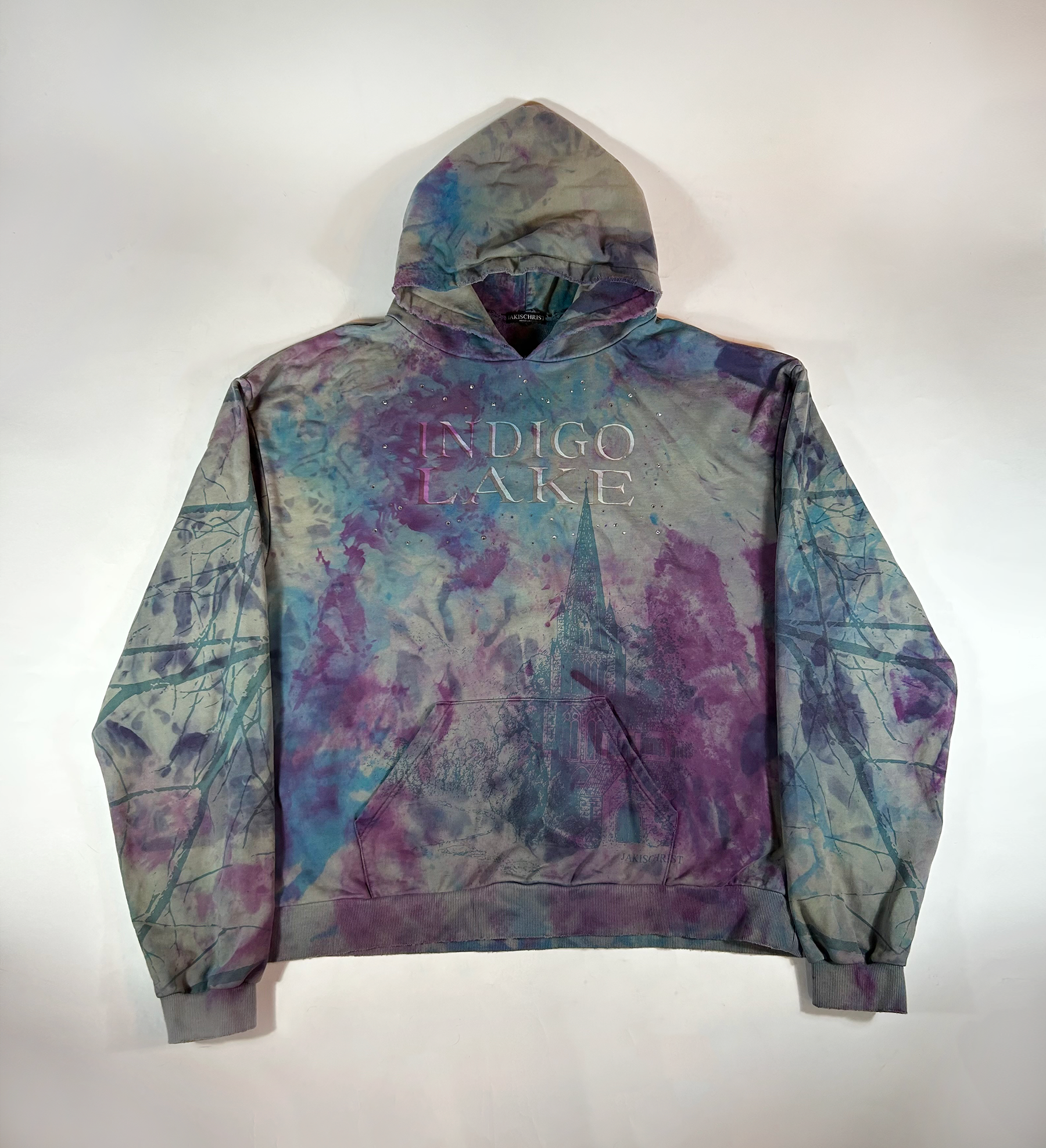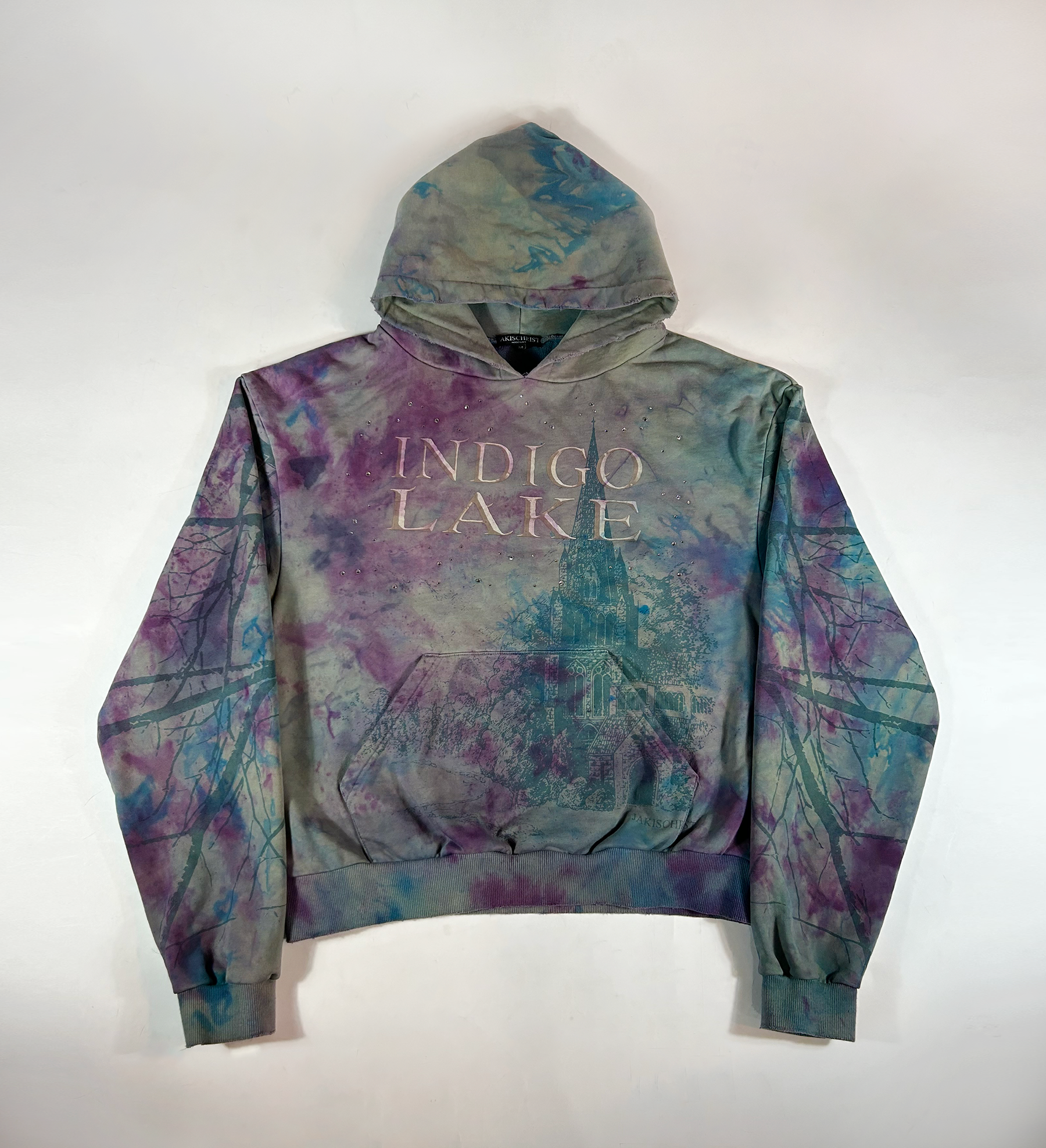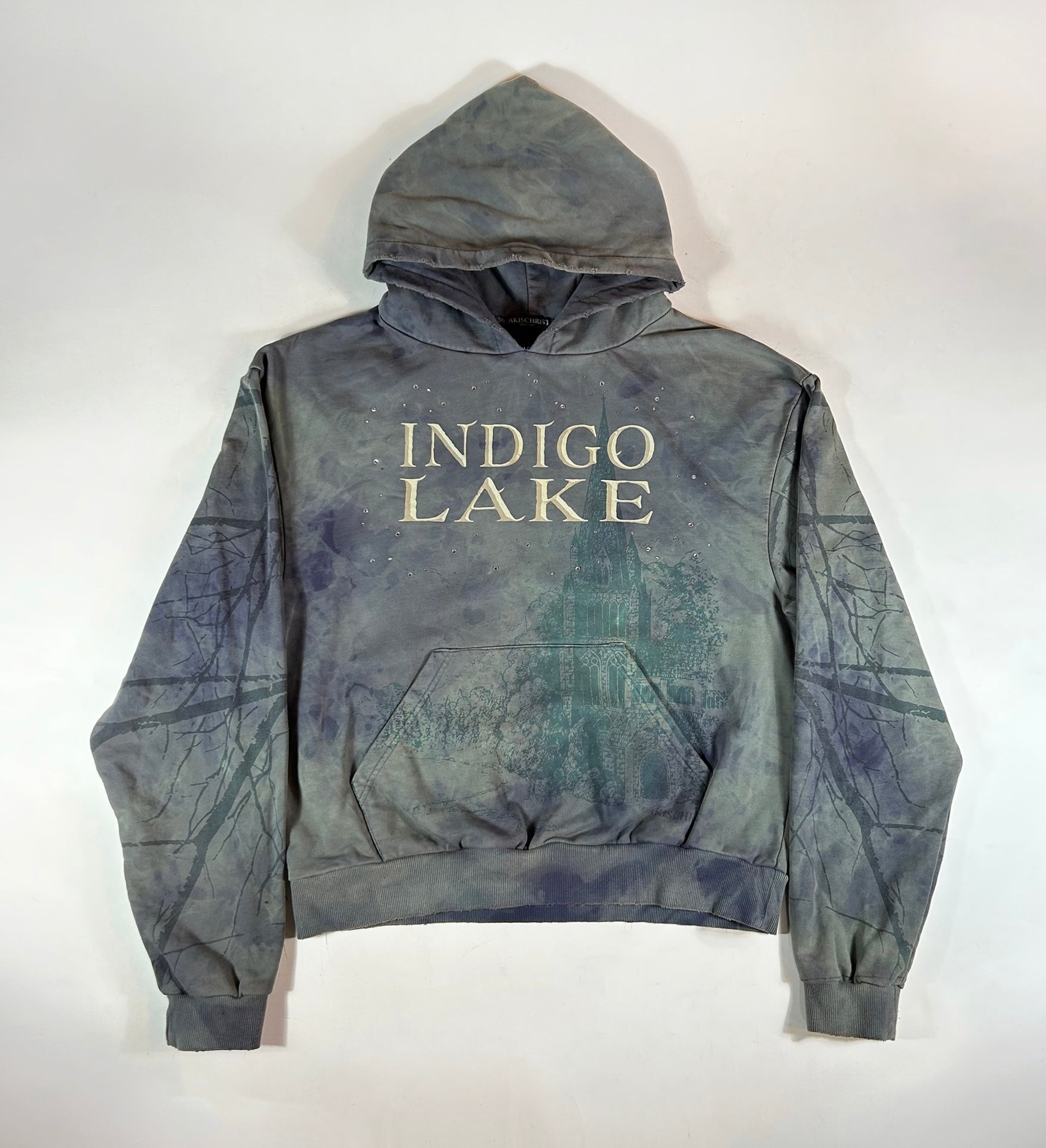 1 of 1 dye-stripped and re-dyed Indigo Lake hoodies.