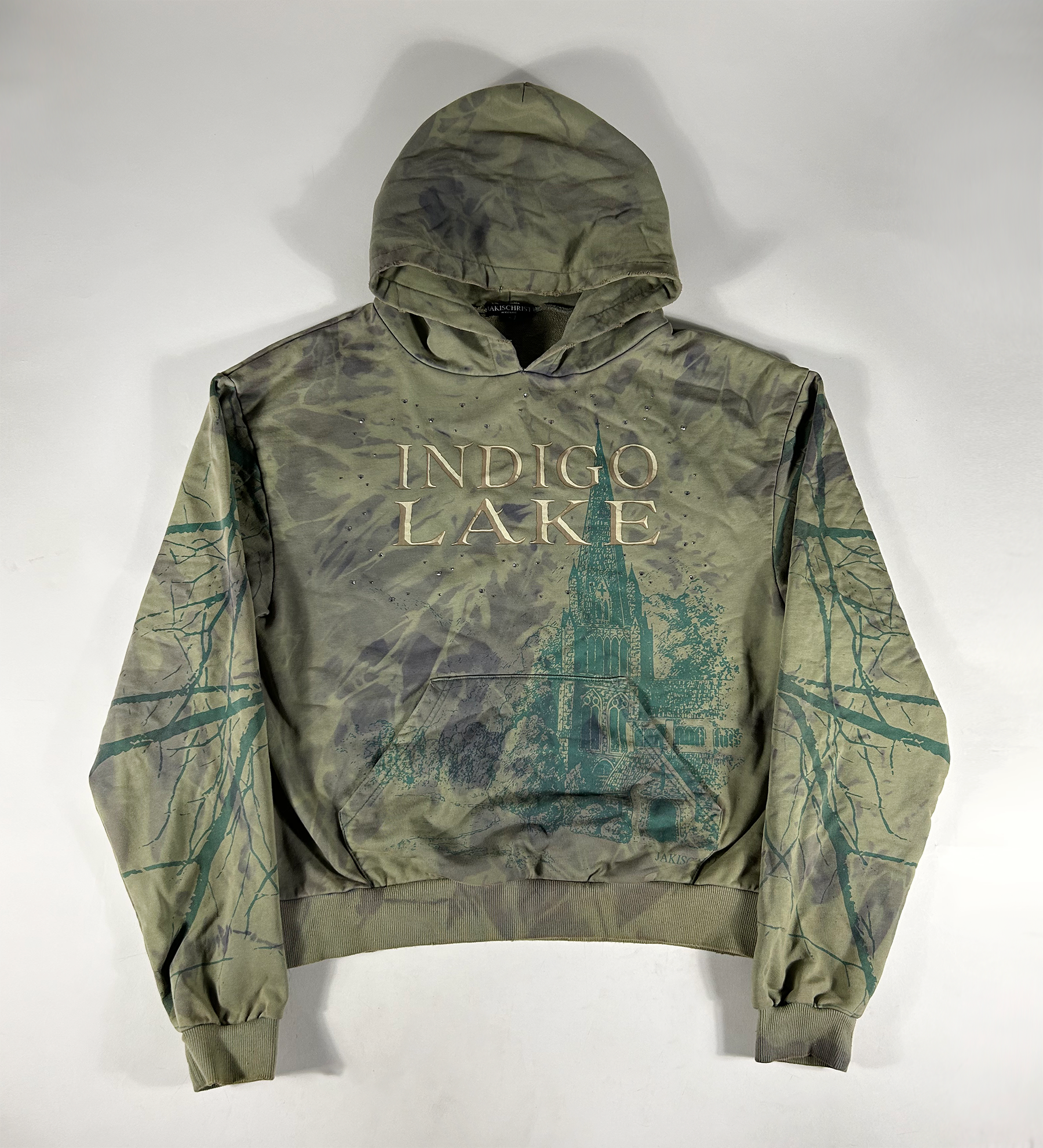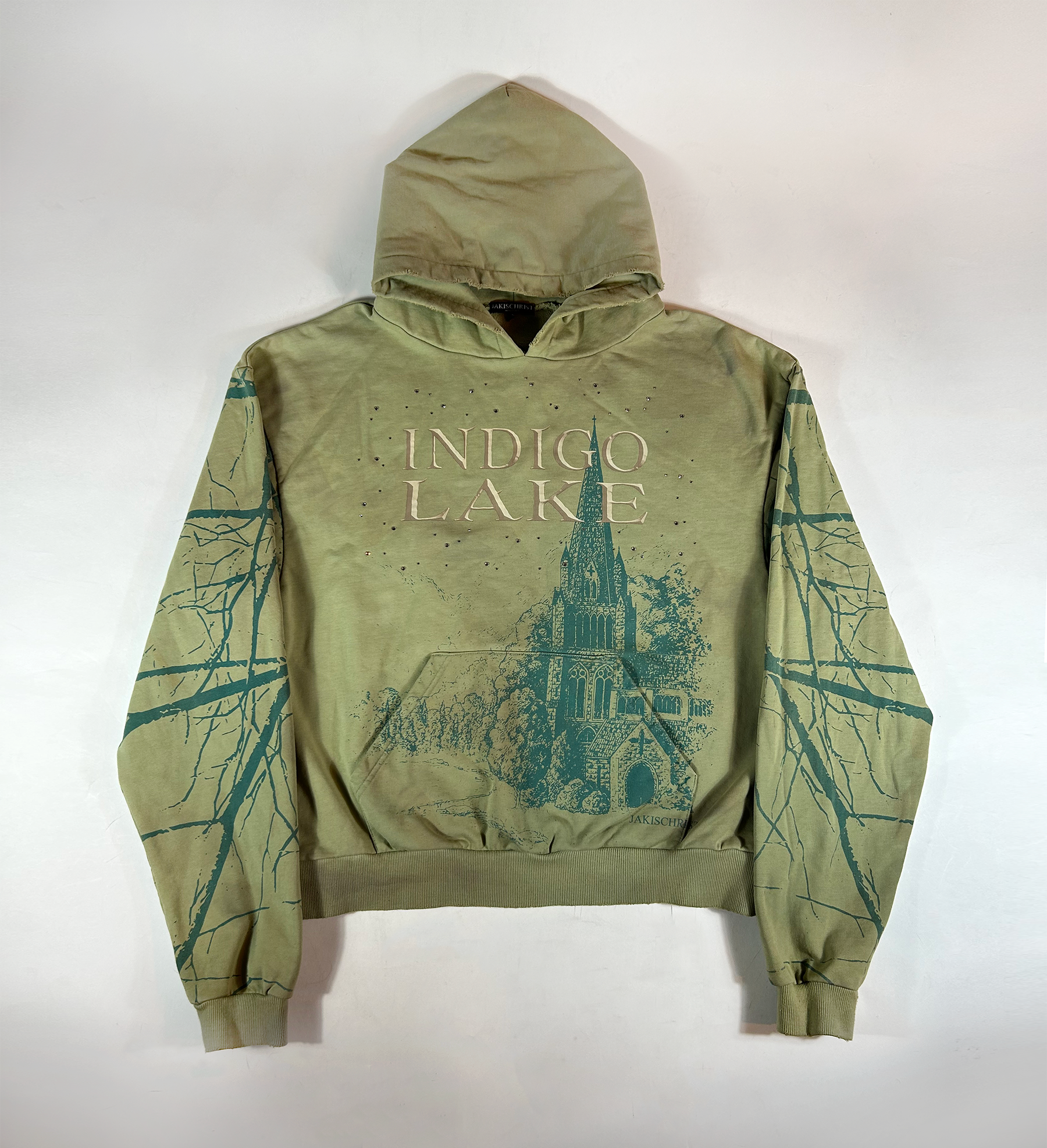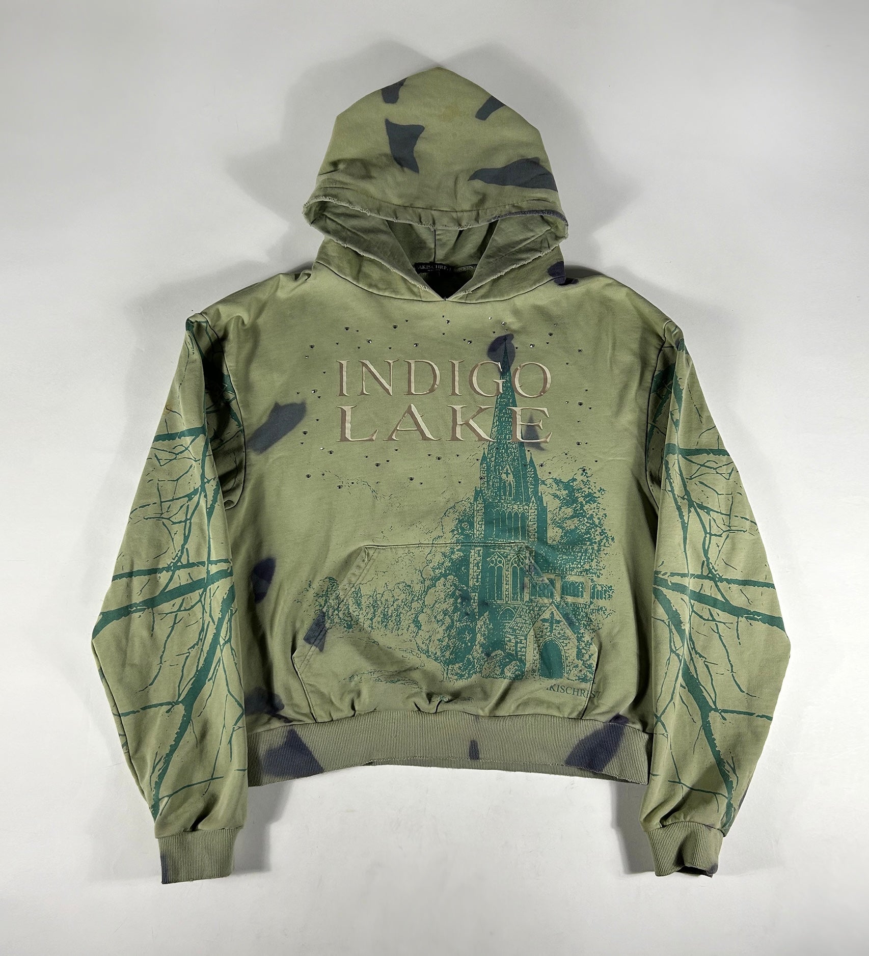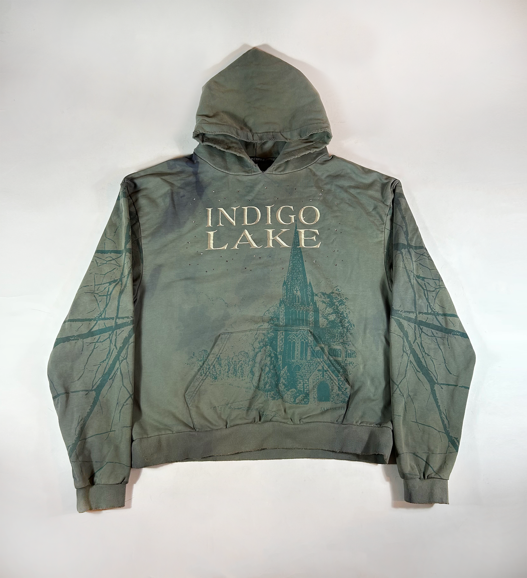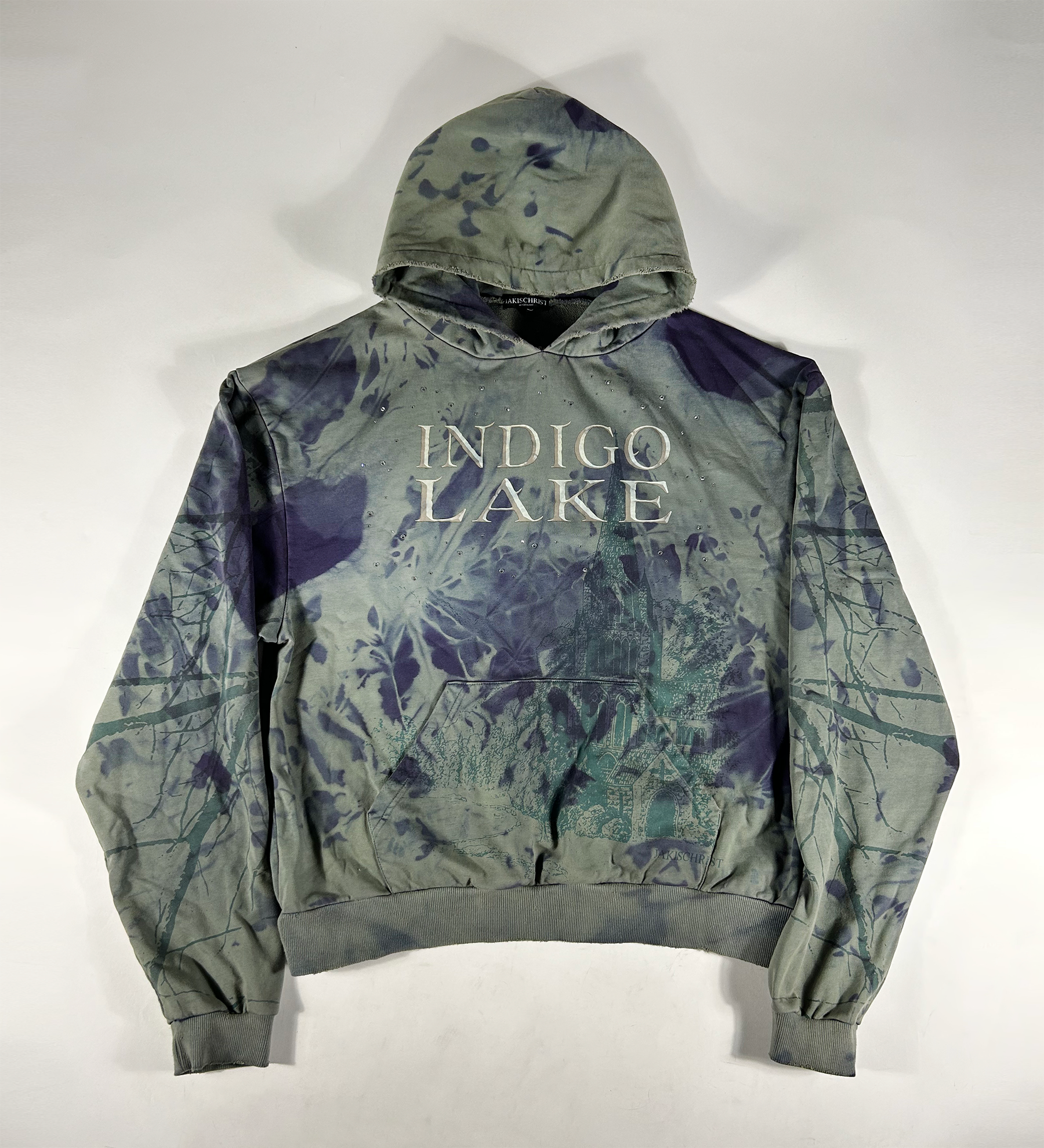 1 of 1 dye-stripped and re-dyed Indigo Lake hoodies.