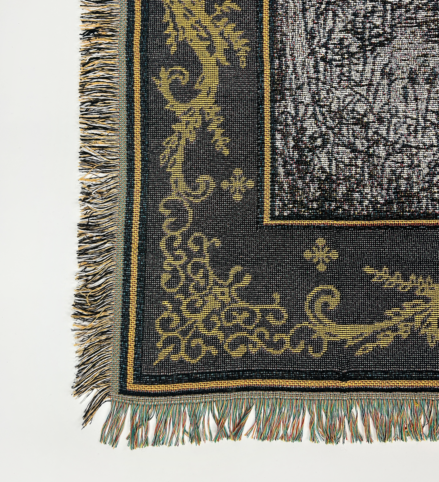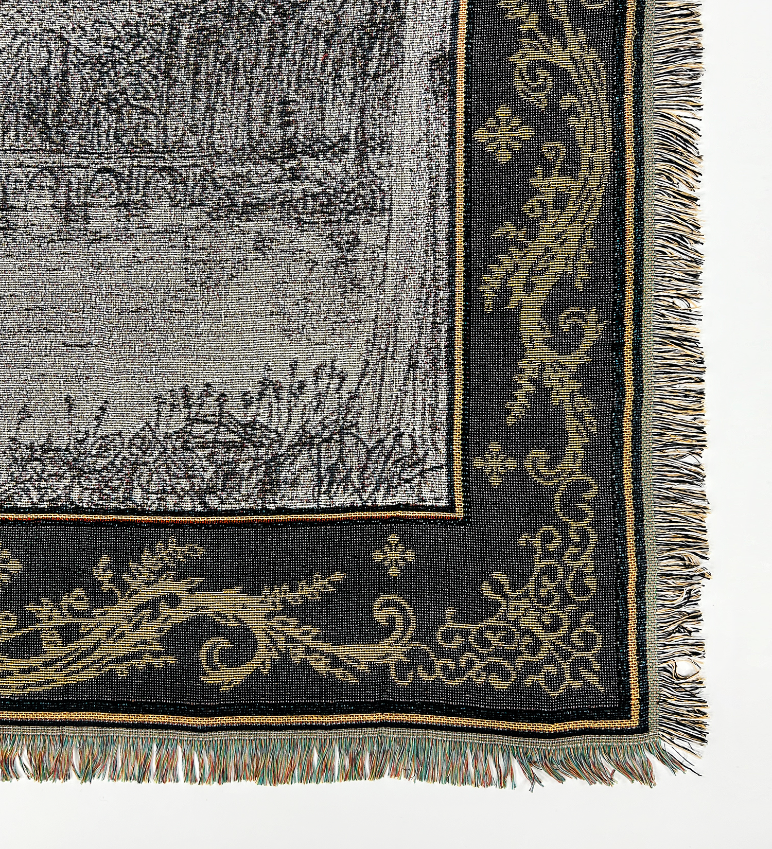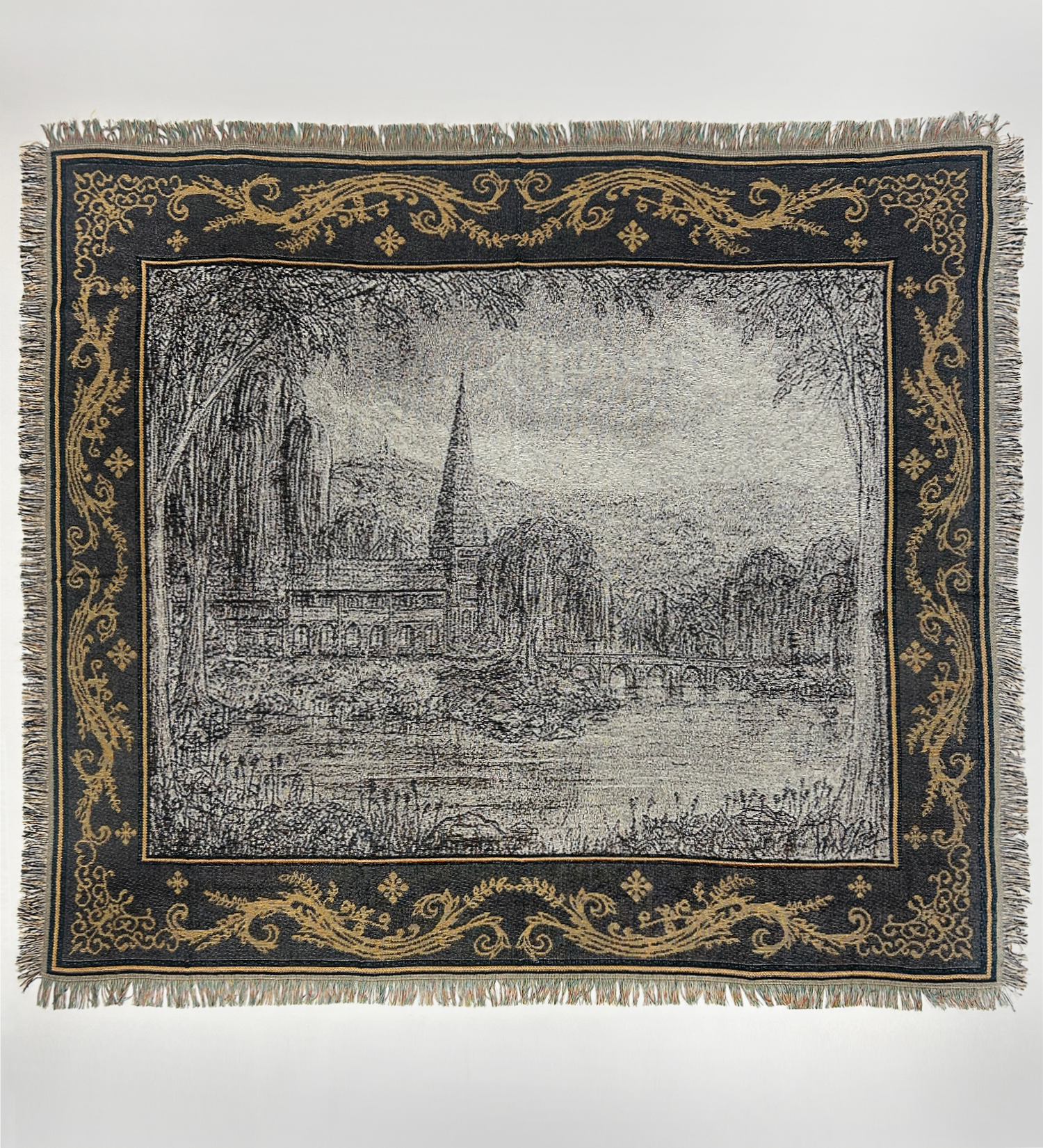 Woven tapestry blanket with "Dungeon" illustration artwork & gold border.