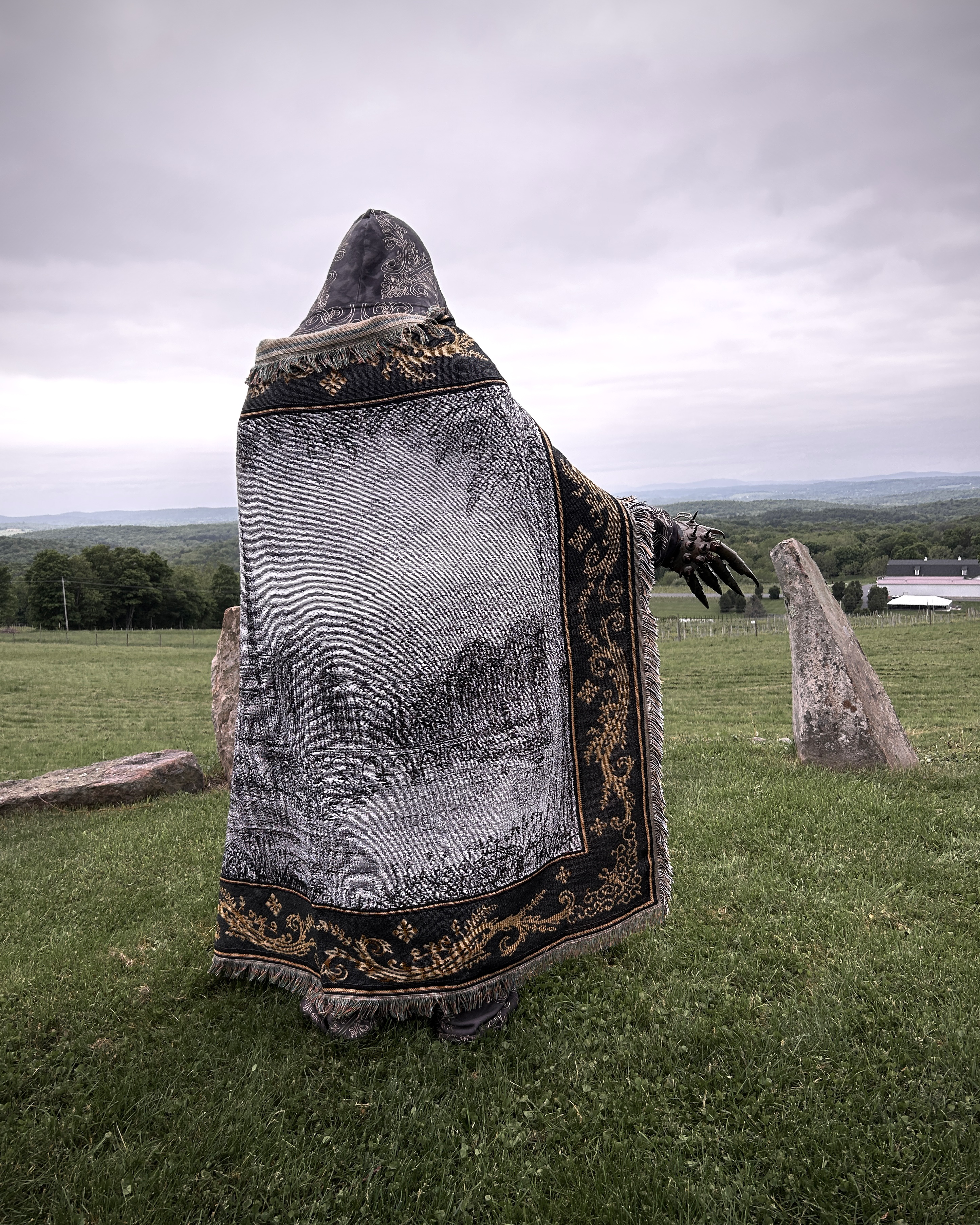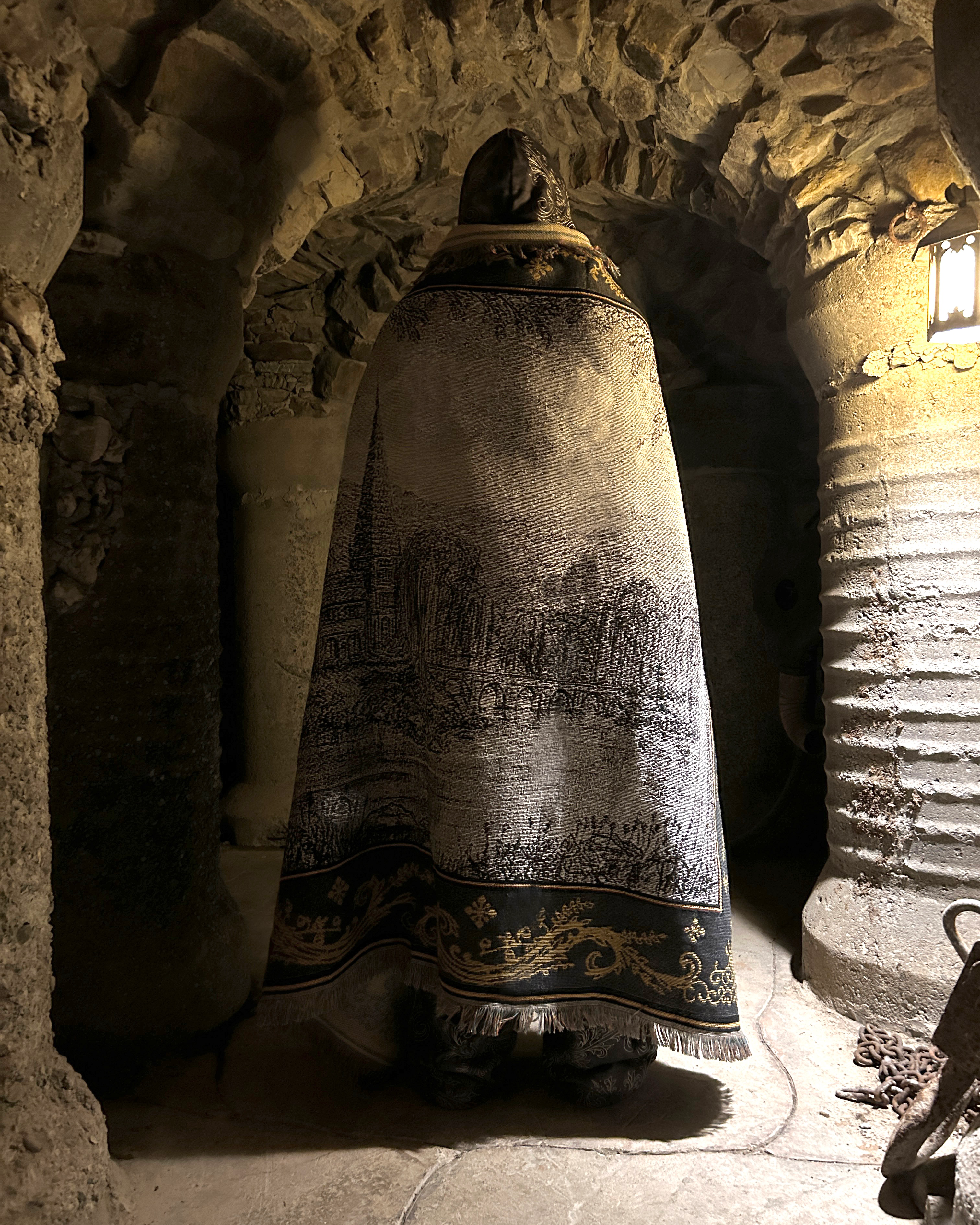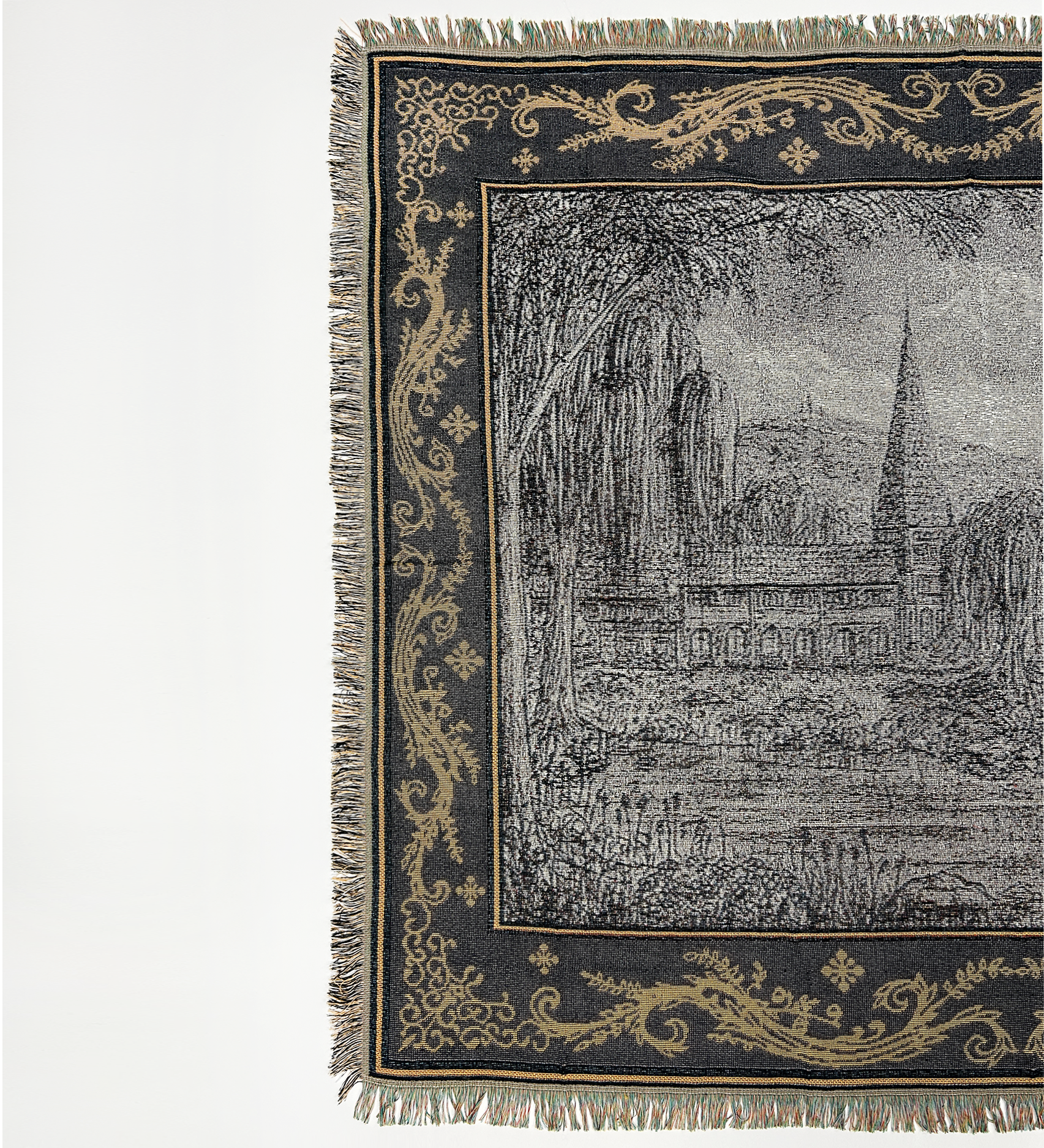 Woven tapestry blanket with "Dungeon" illustration artwork & gold border.