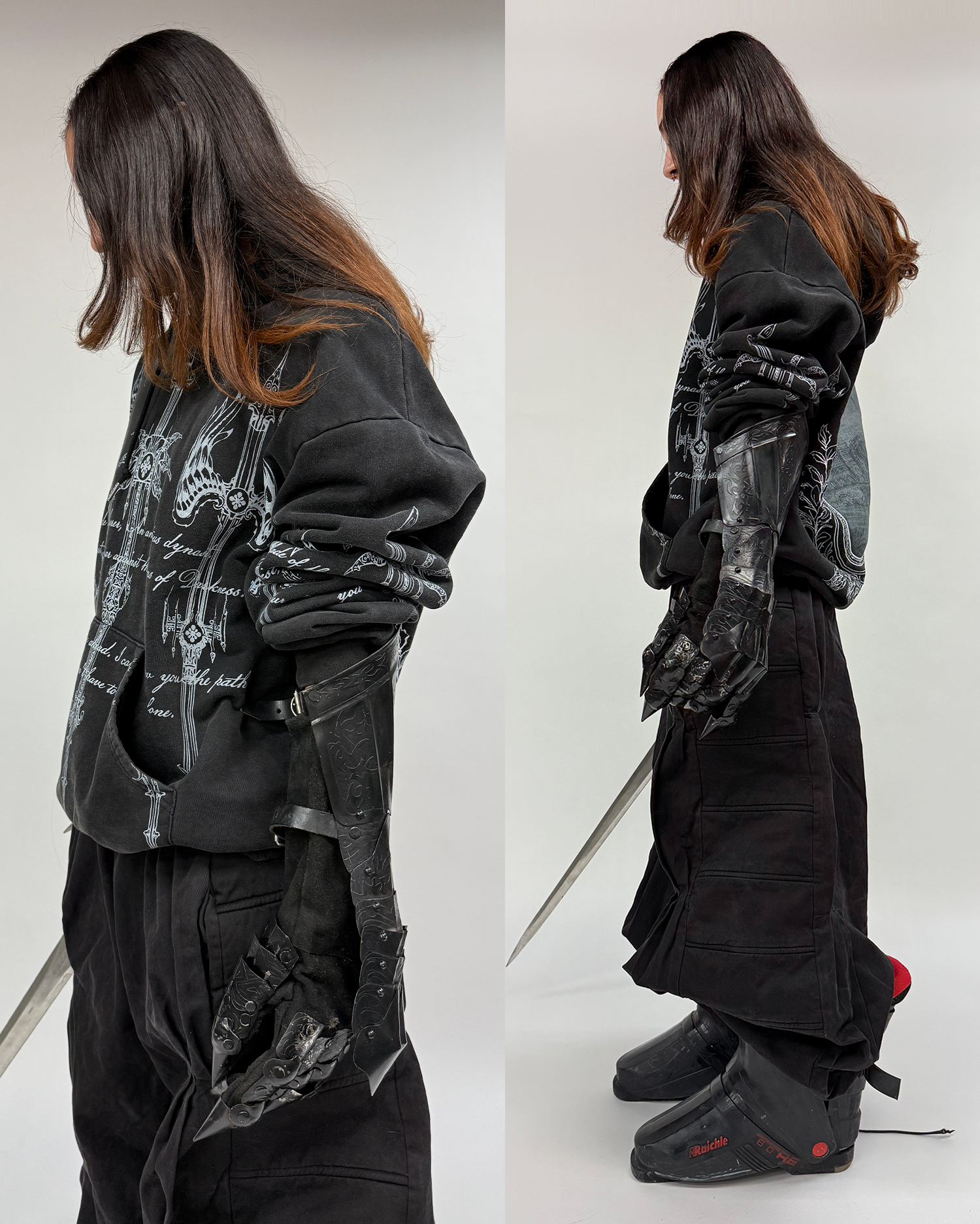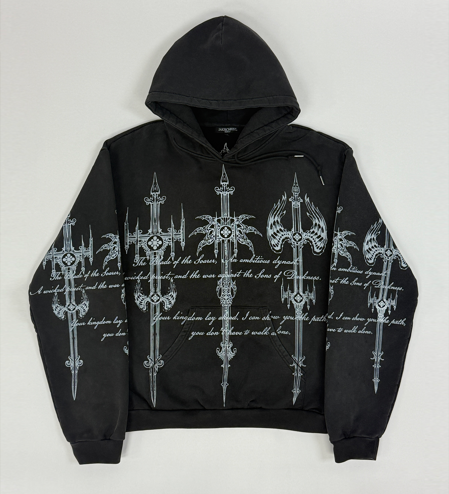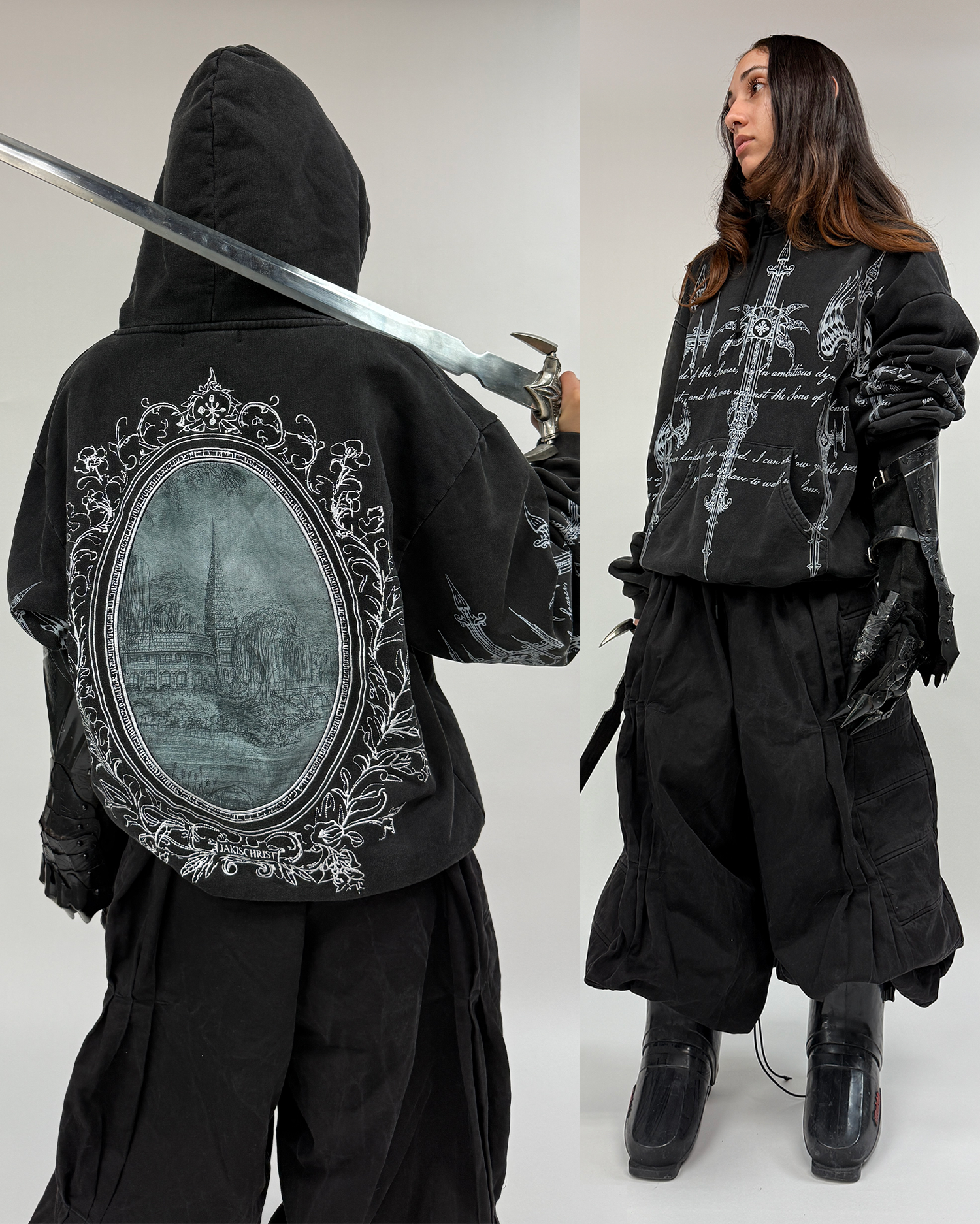 Screen printed swords, embroidered frame around cut-out illustration panel.